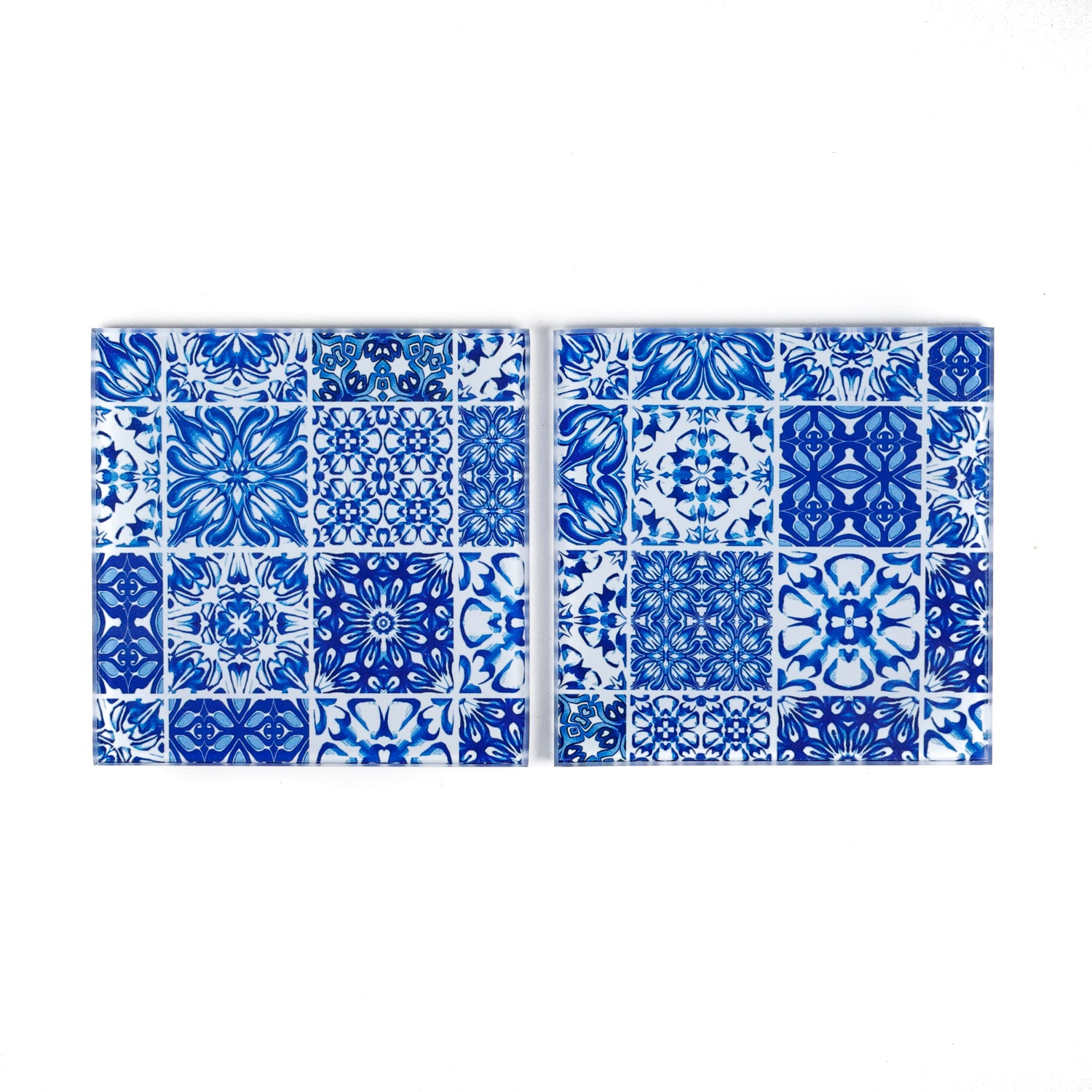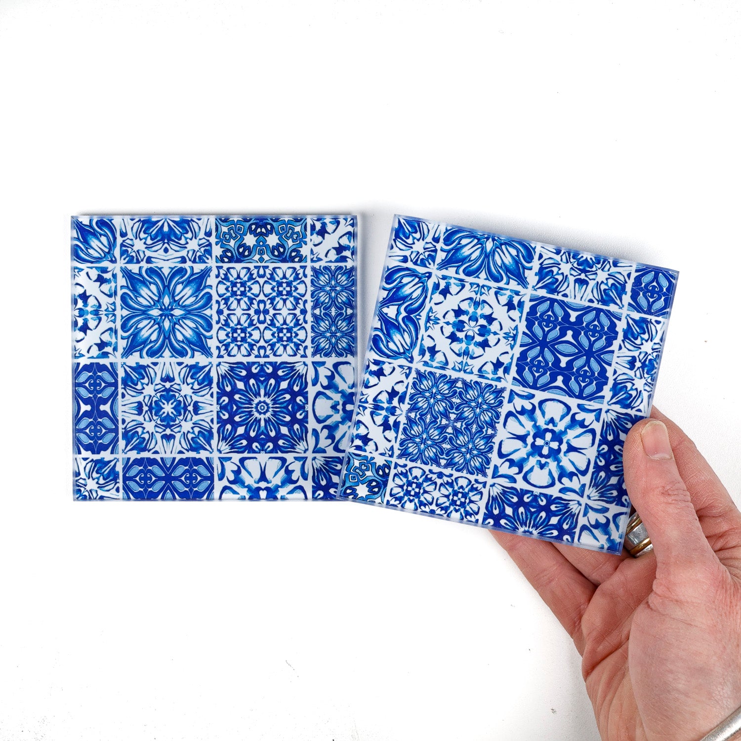 SALE - 2 x Small Mixed Tiles - Blue & White - square glass coasters