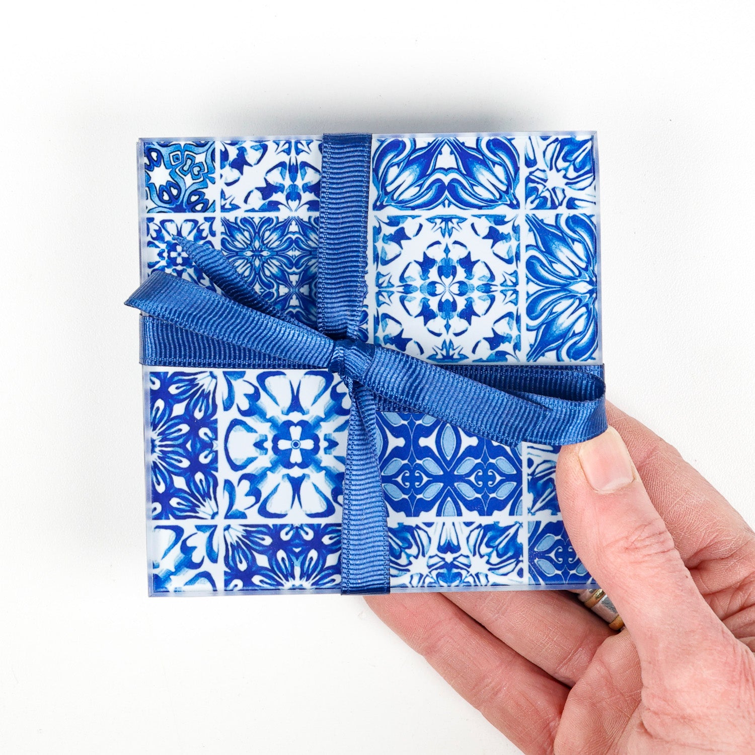 These beautifully made, heavyweight glass coasters feature our small mixed tile design.