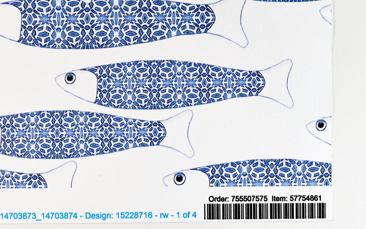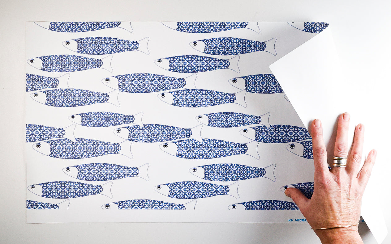 This is a 60cm x 30cm Peel & Stick wallpaper sample in the Blue & White Ocean Shoal design.