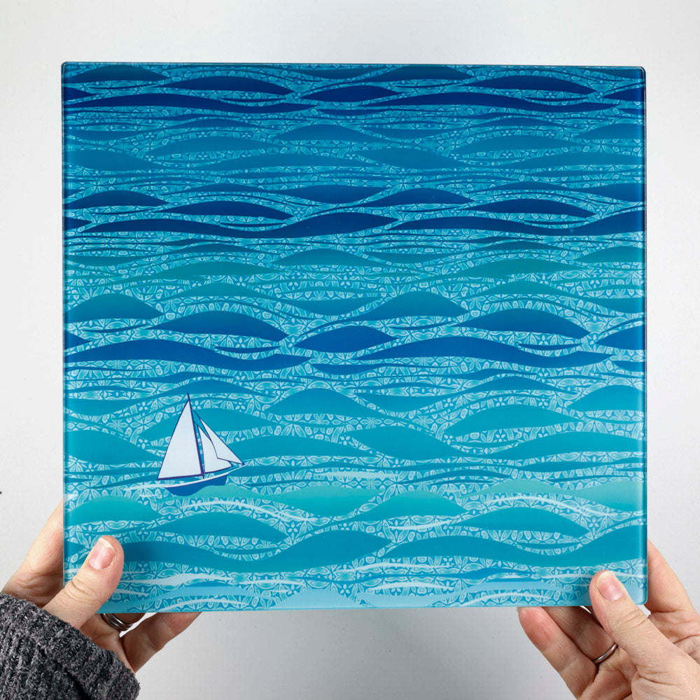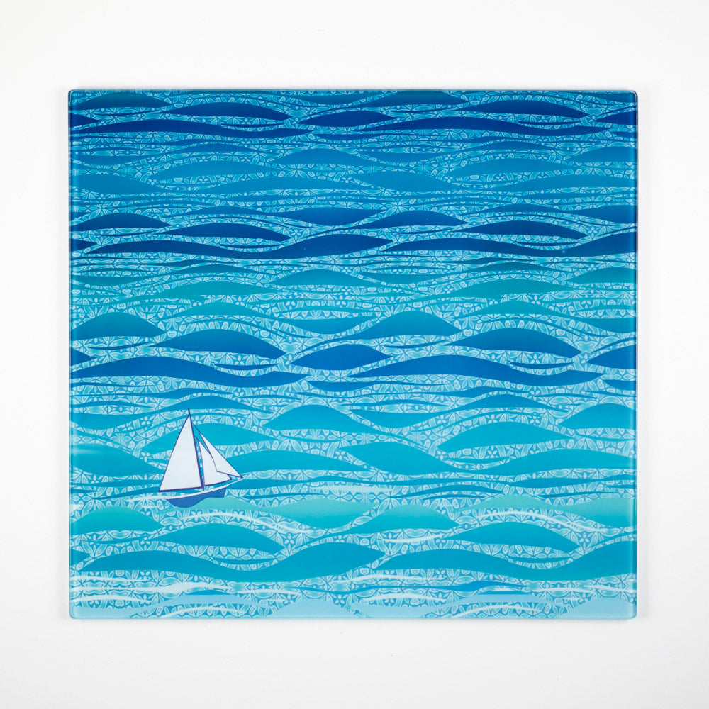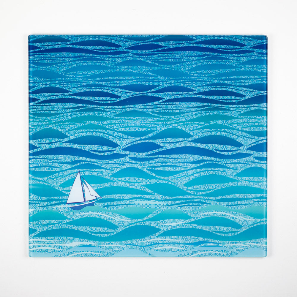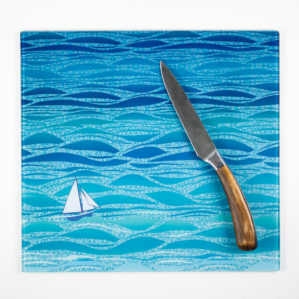 A cheerful blue and white boat sails across a turquoise millefiori sea on this heatproof chopping board / trivet