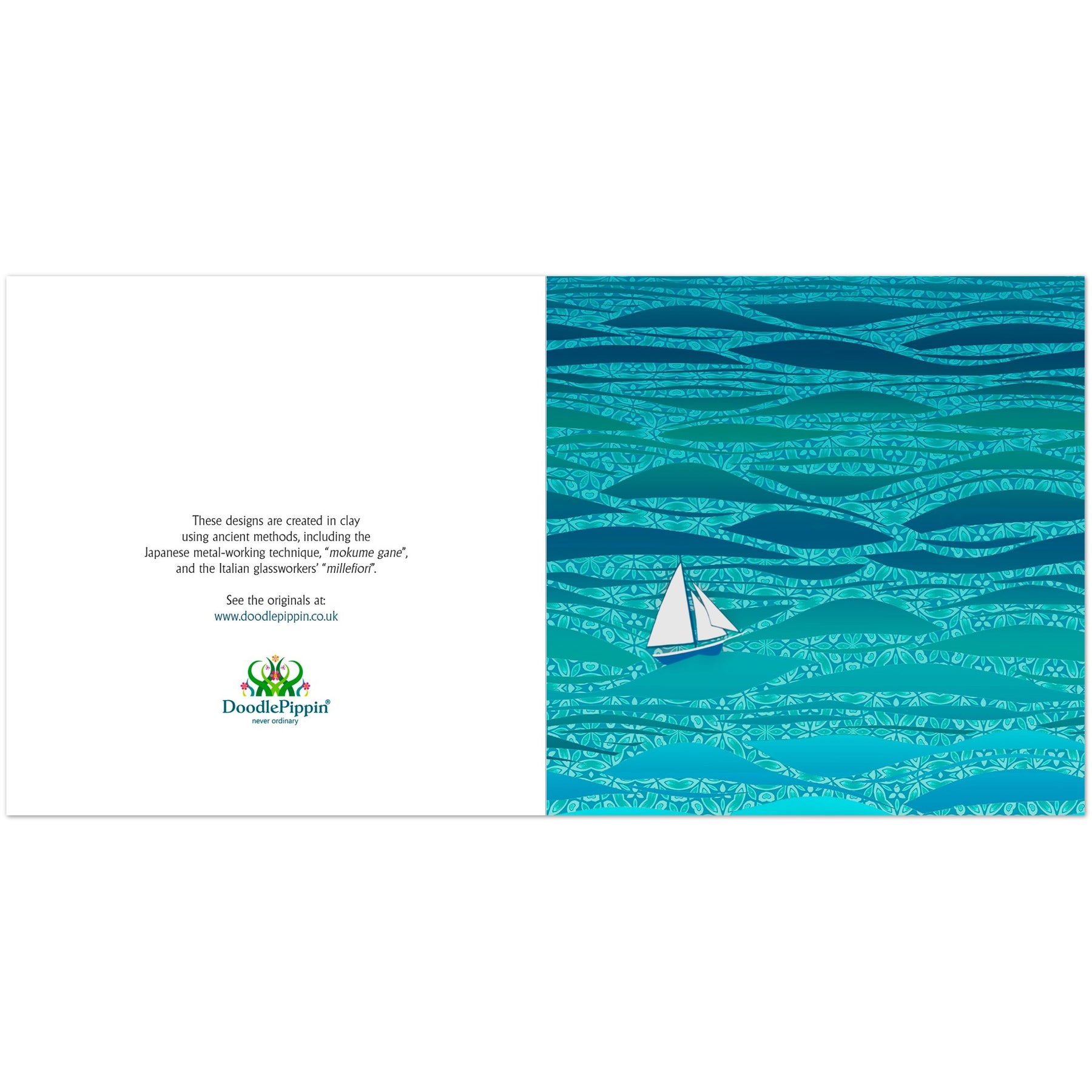 A quality card featuring a peaceful white yacht on a glorious turquoise, teal and aquamarine millefiori sea.