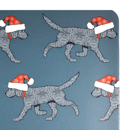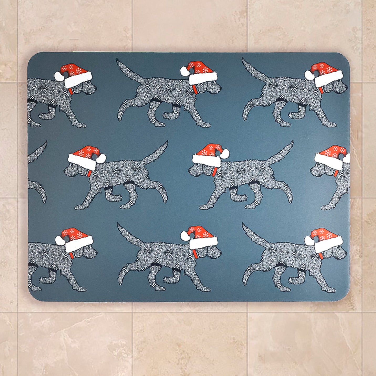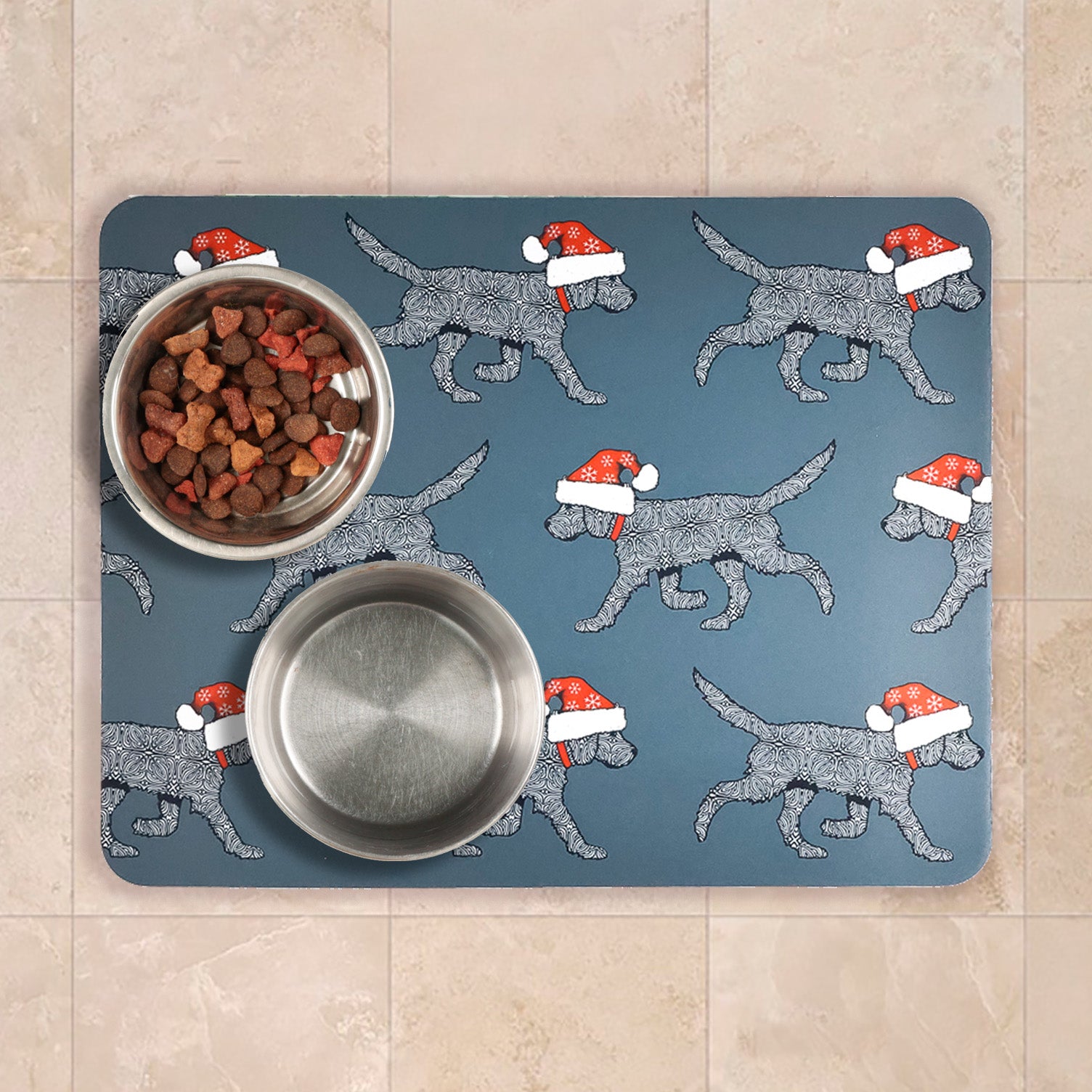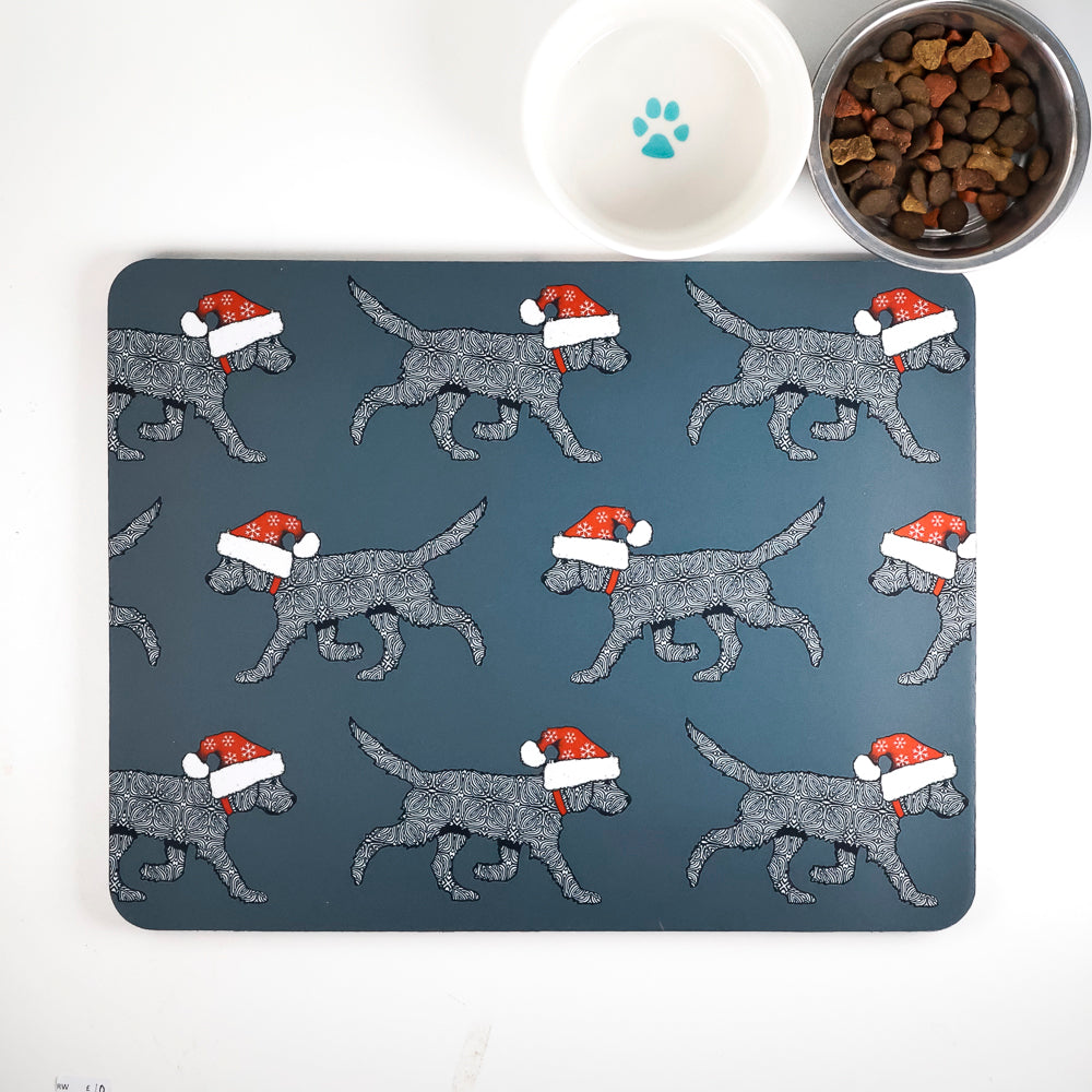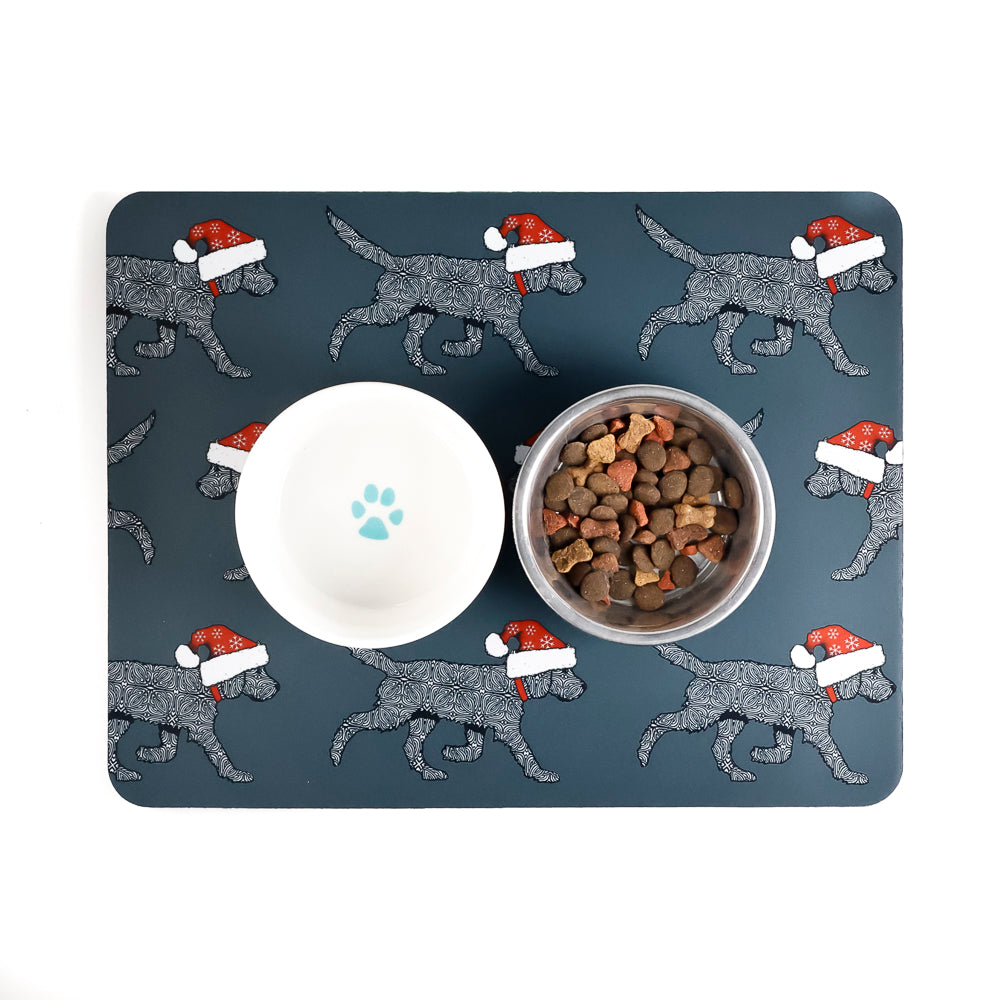 This large neoprene pet food placemat features a cheerful host of millefiori-patterned Labradors / Labradoodles wearing festive Christmas hats, on a dark blue-grey background.