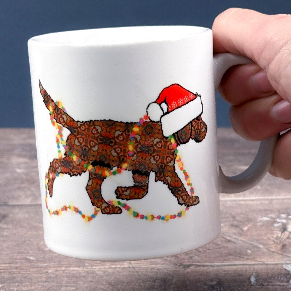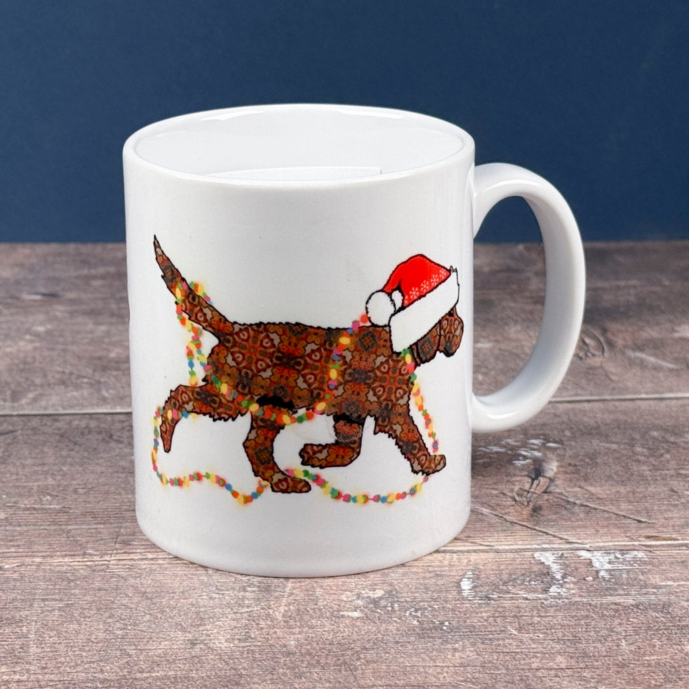 High quality white mug with a cute chocolate/brown colour trotting pup design (complete with festive Christmas bobble hat and festooned with a string of multi-coloured fairy lights).