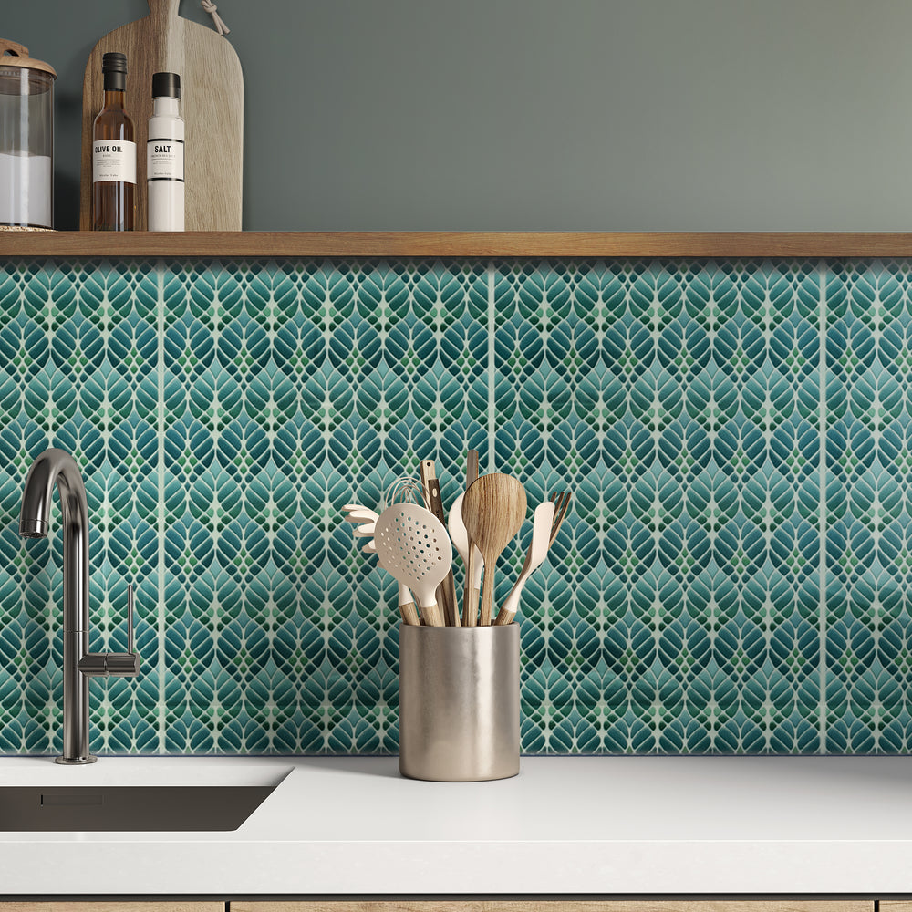 A lovely blue-green-turquoise design (which really reminds me of Art Nouveau twining, nature-inspired patterns) on a large rectangular ceramic tile.