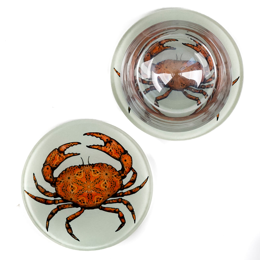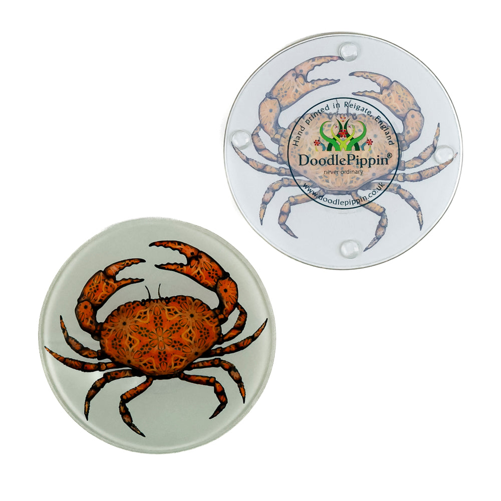 The bright orange crab on these coasters started life as a pattern in a piece of clay and this version has a light grey/sandy coloured background. A darker grey version is also available.