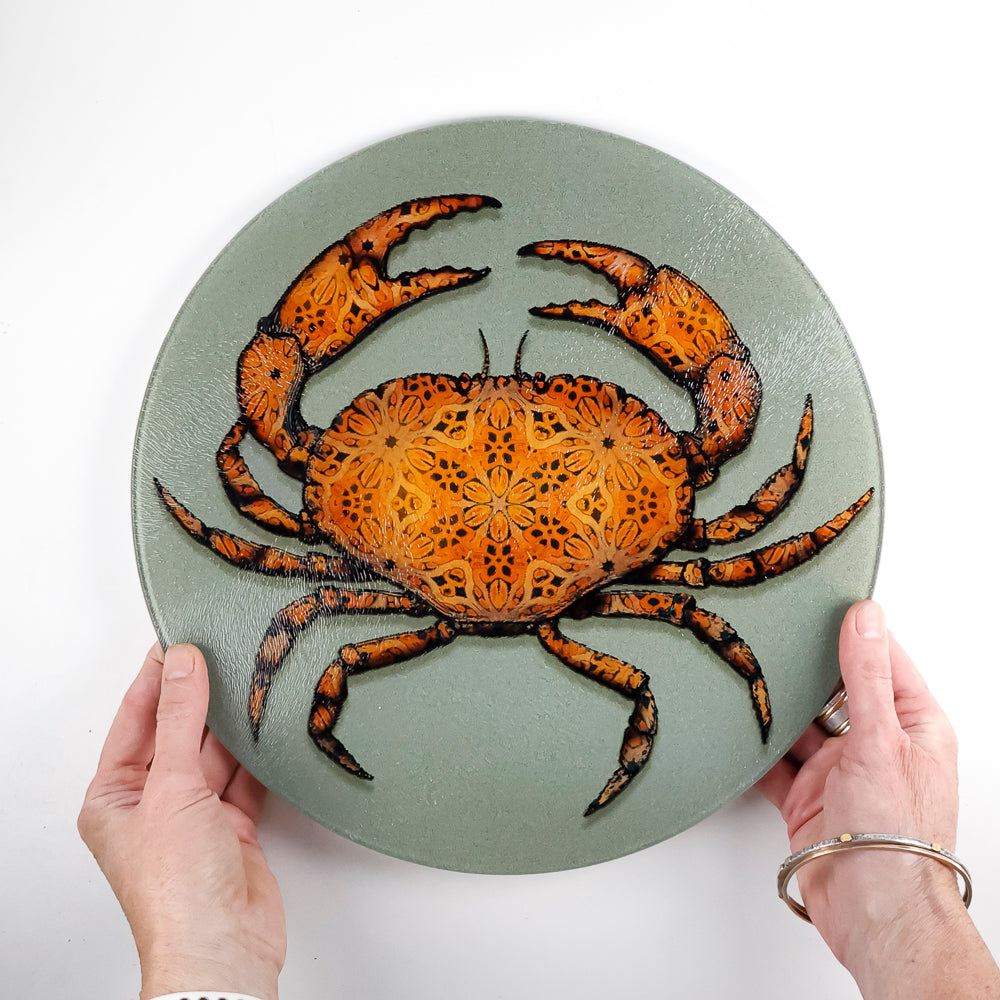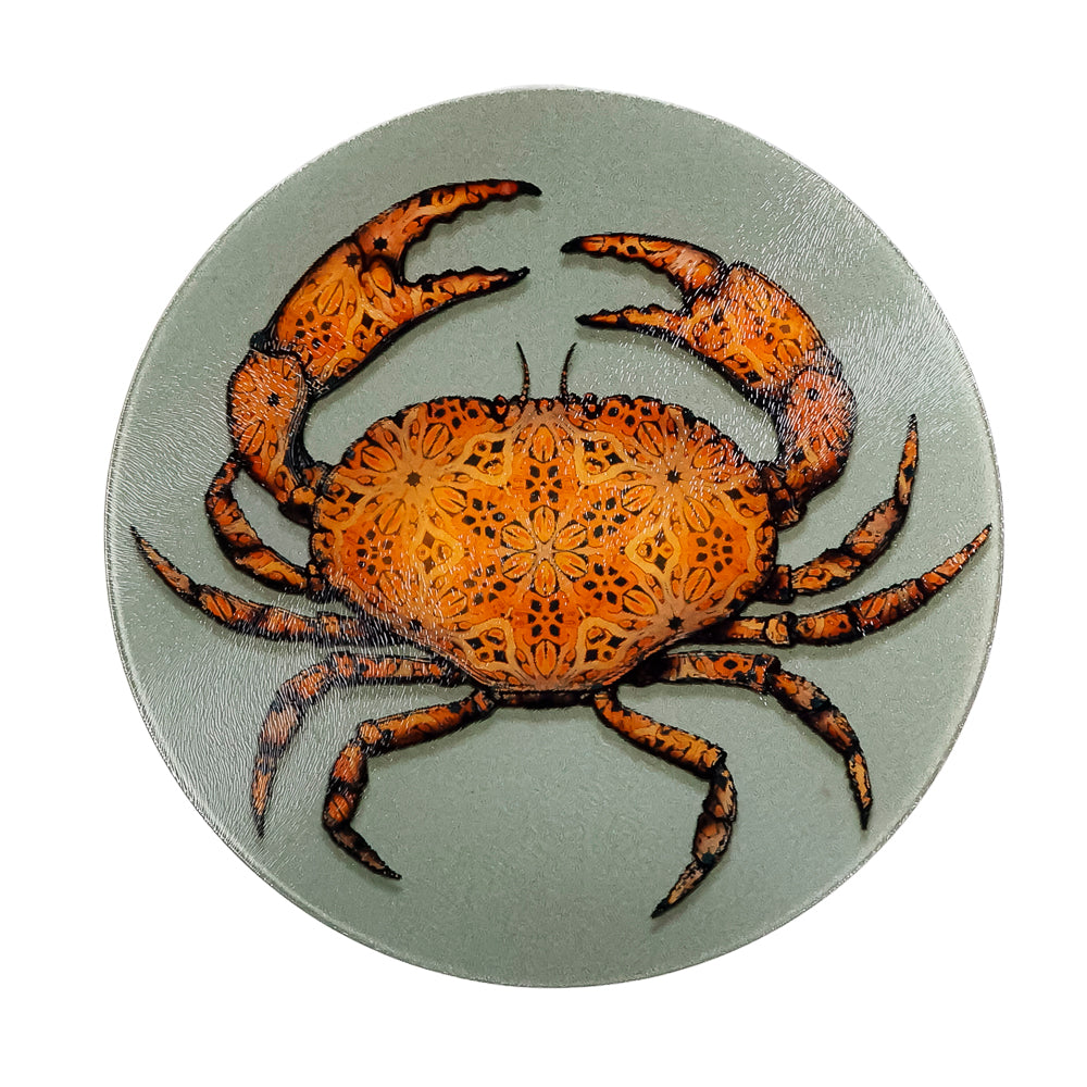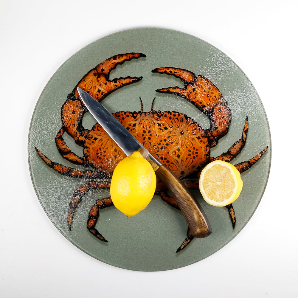 A cheerful hand-drawn orange millefiori crab takes centre-stage on this toughened glass chopping board. This version has a dark grey background (there is also a lighter grey version available).