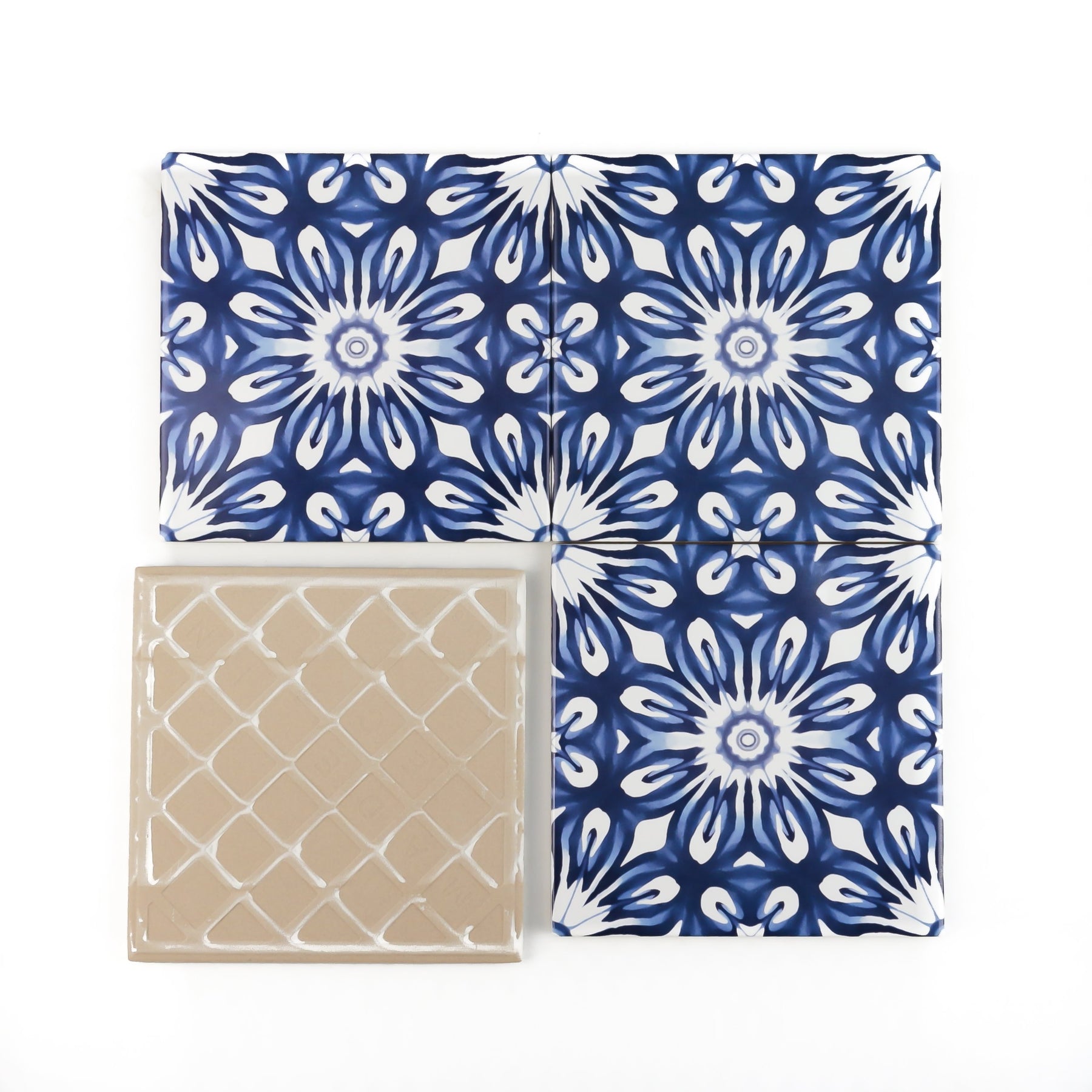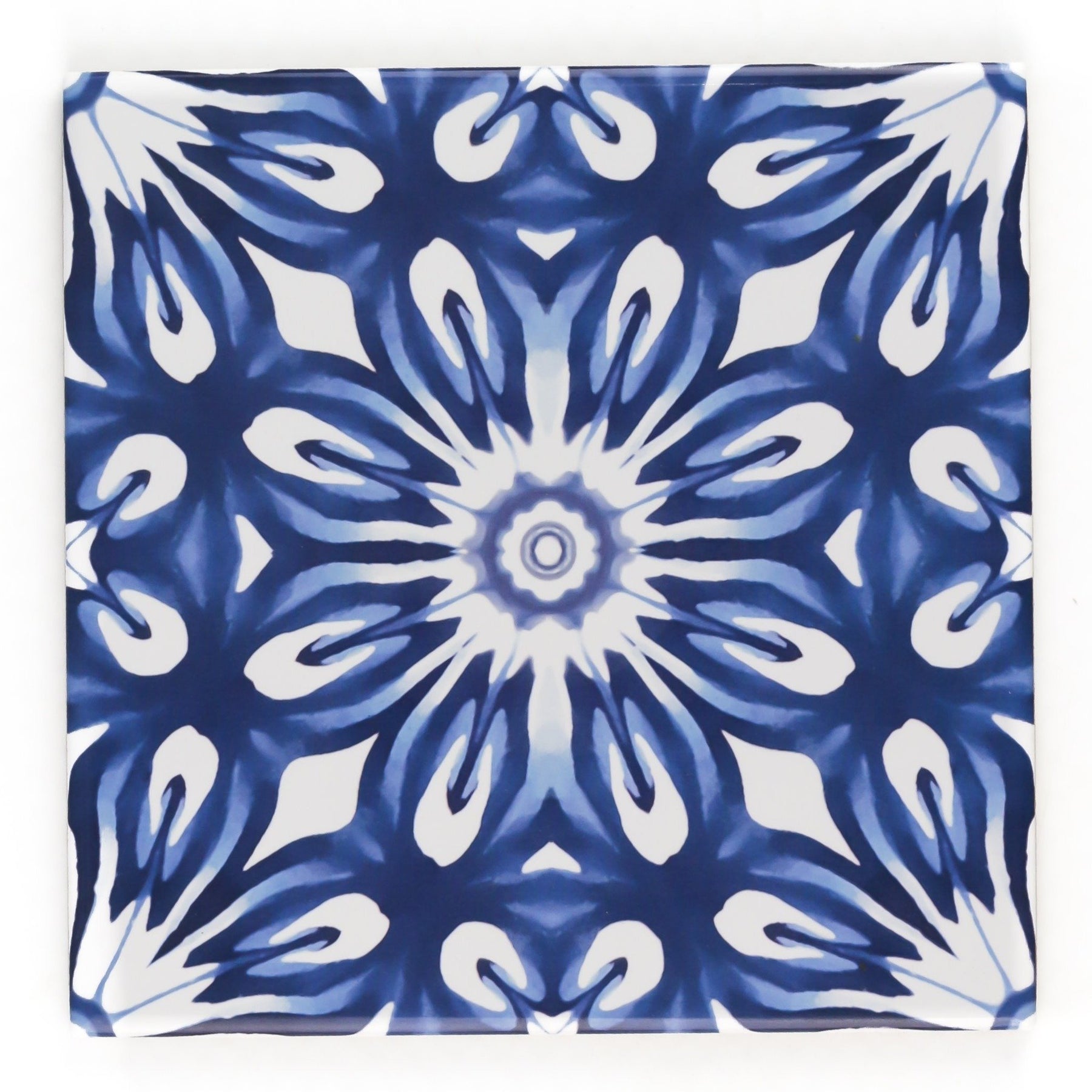 Rich navy and white tiles with a bold flower design that reminds me of the lovely blue and white tiles produced in the 1600s in Holland.