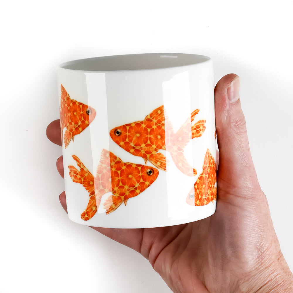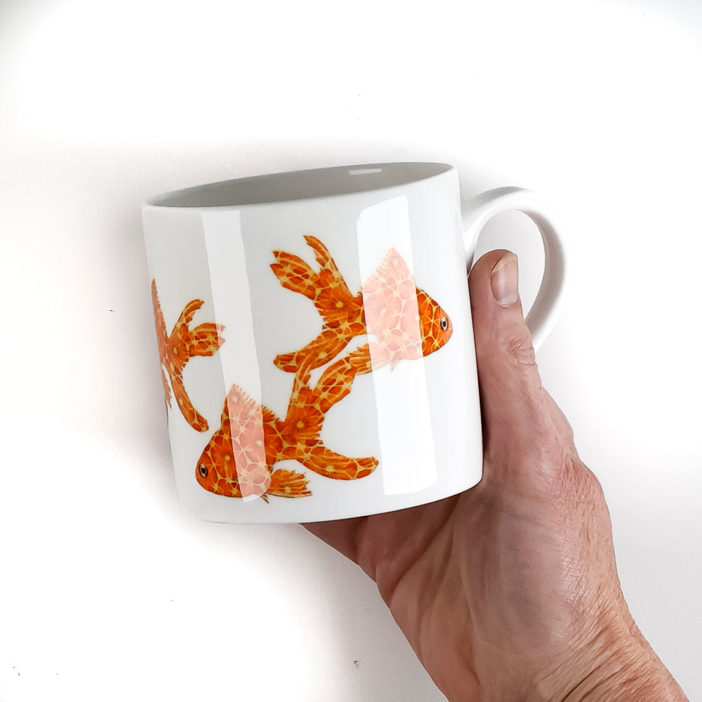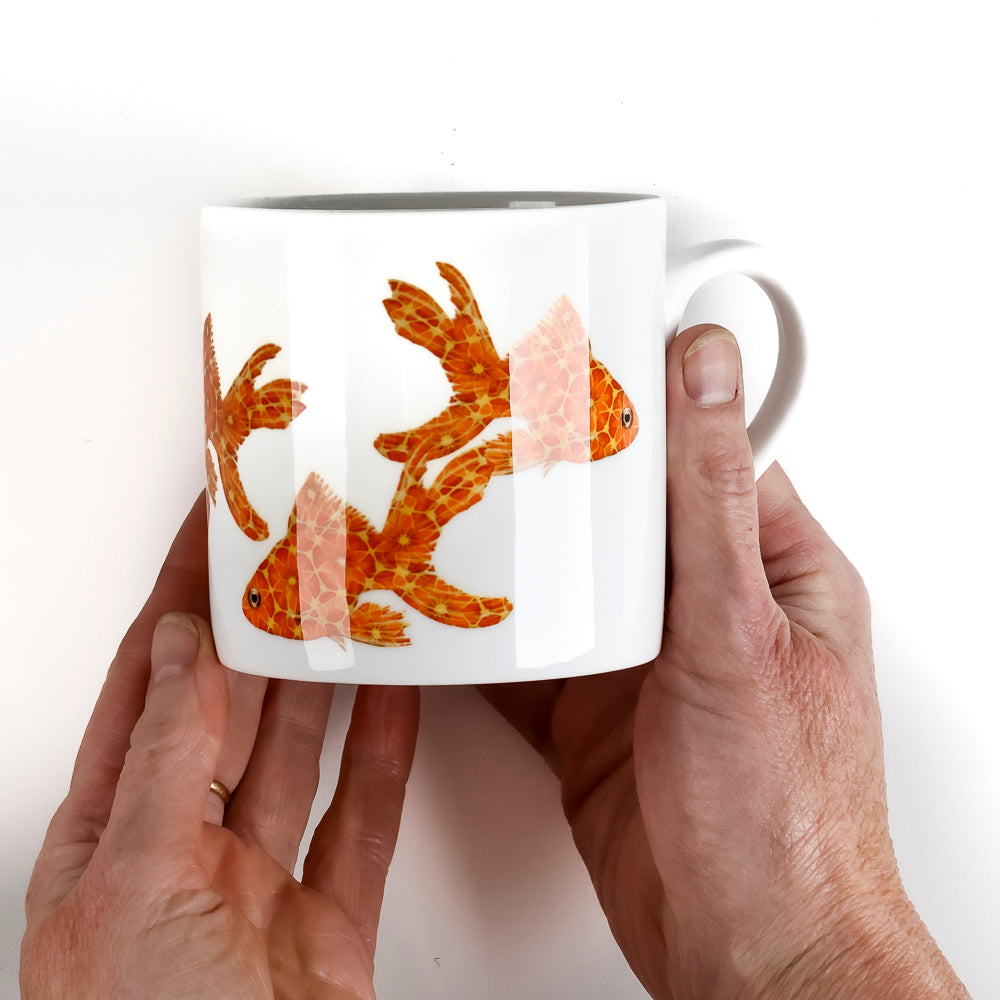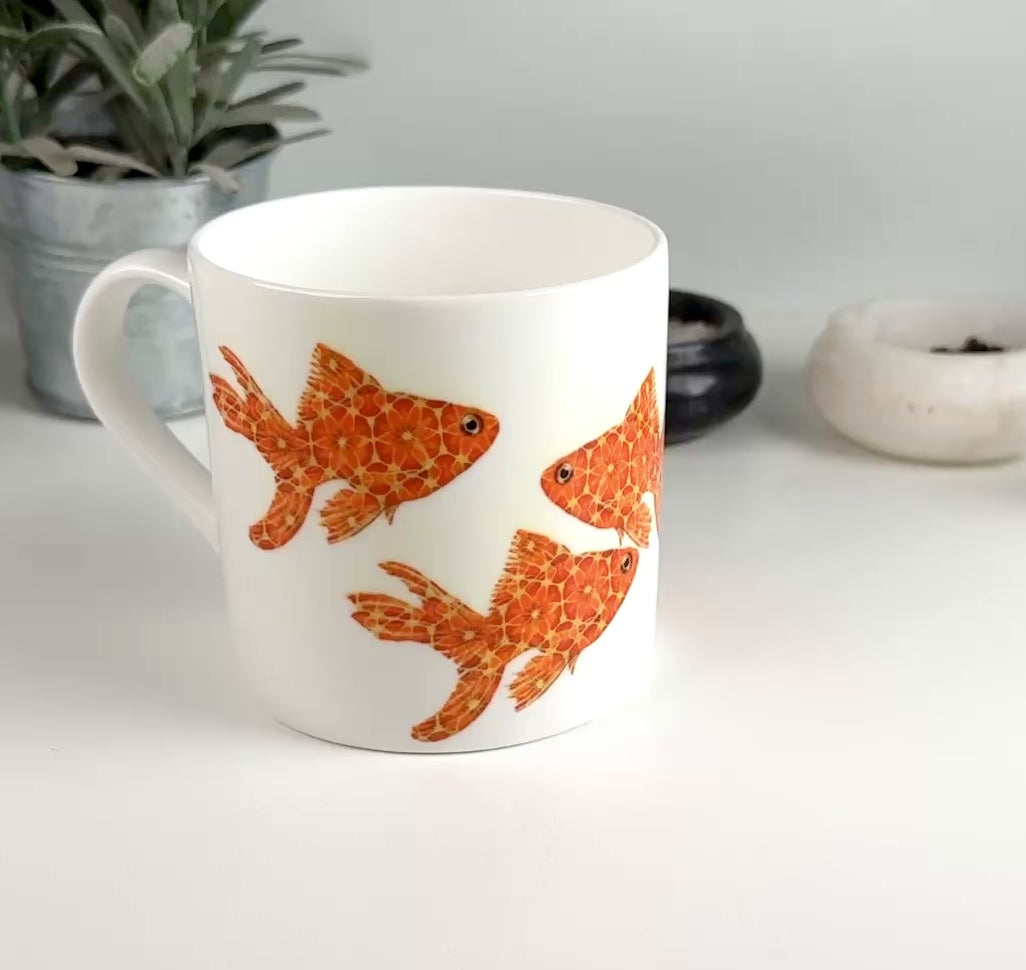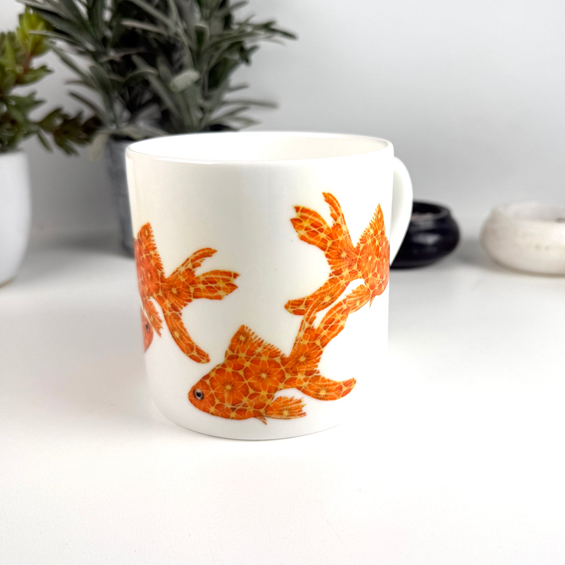 A shoal of bright and beautiful goldfish swim around this high quality white mug.