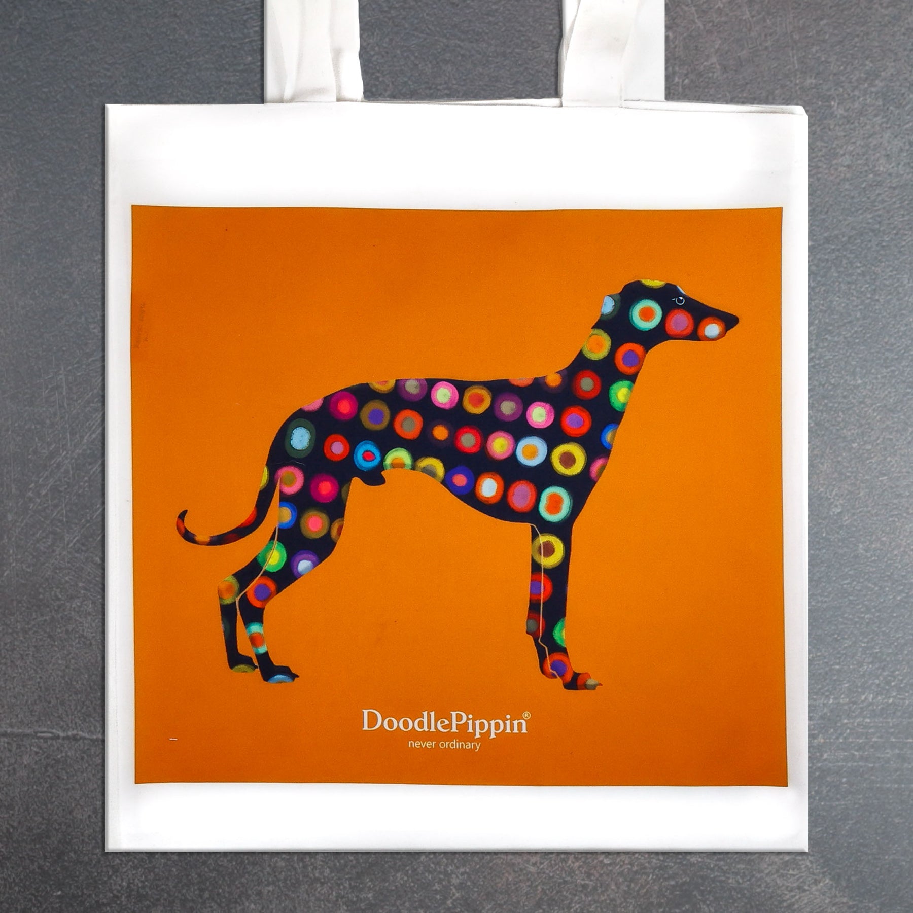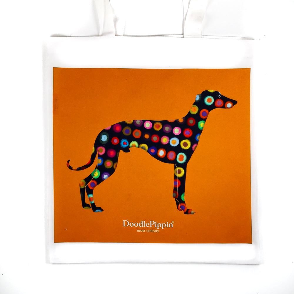 A striking spotty greyhound (or whippet!) on a rich orange background features on this strong tote bag.