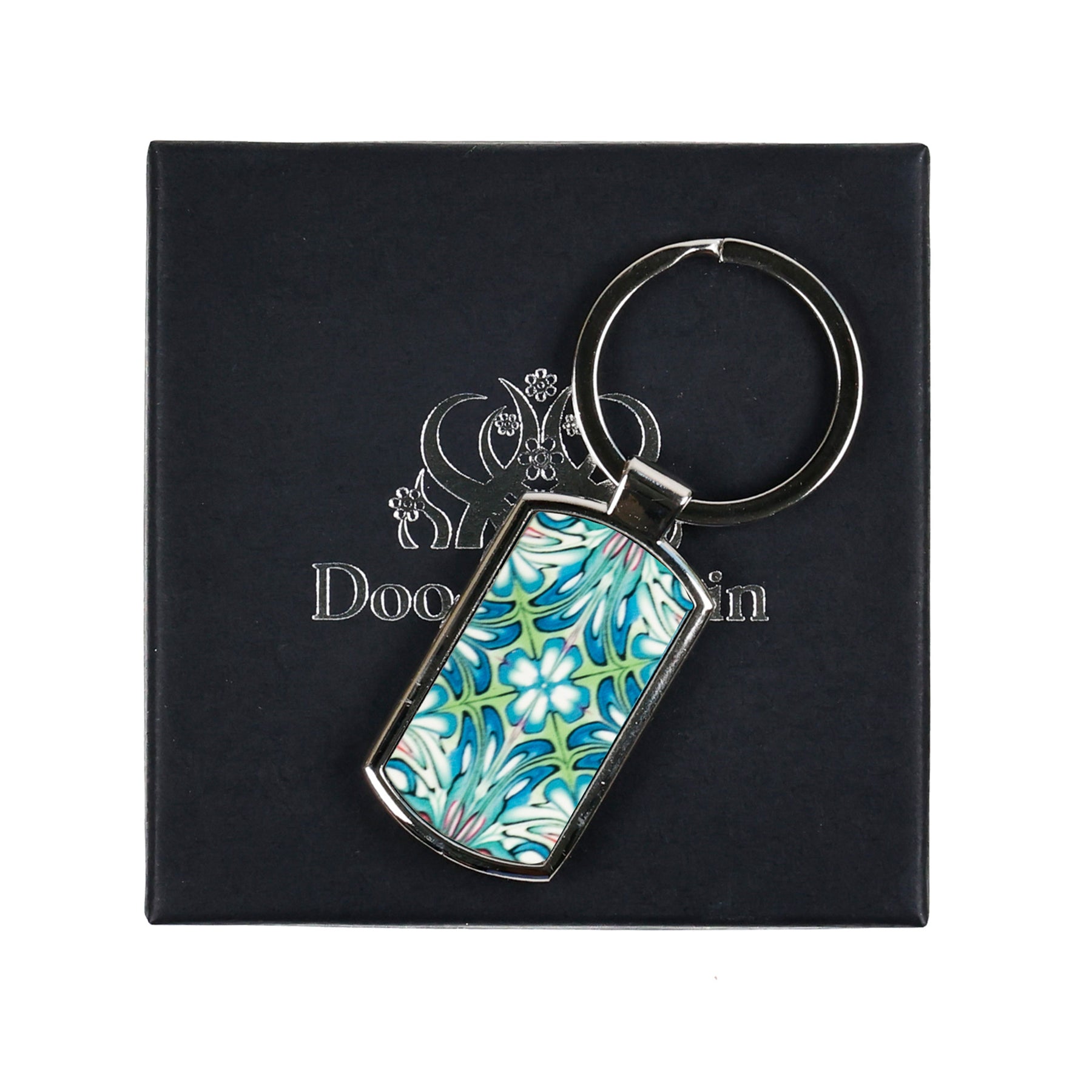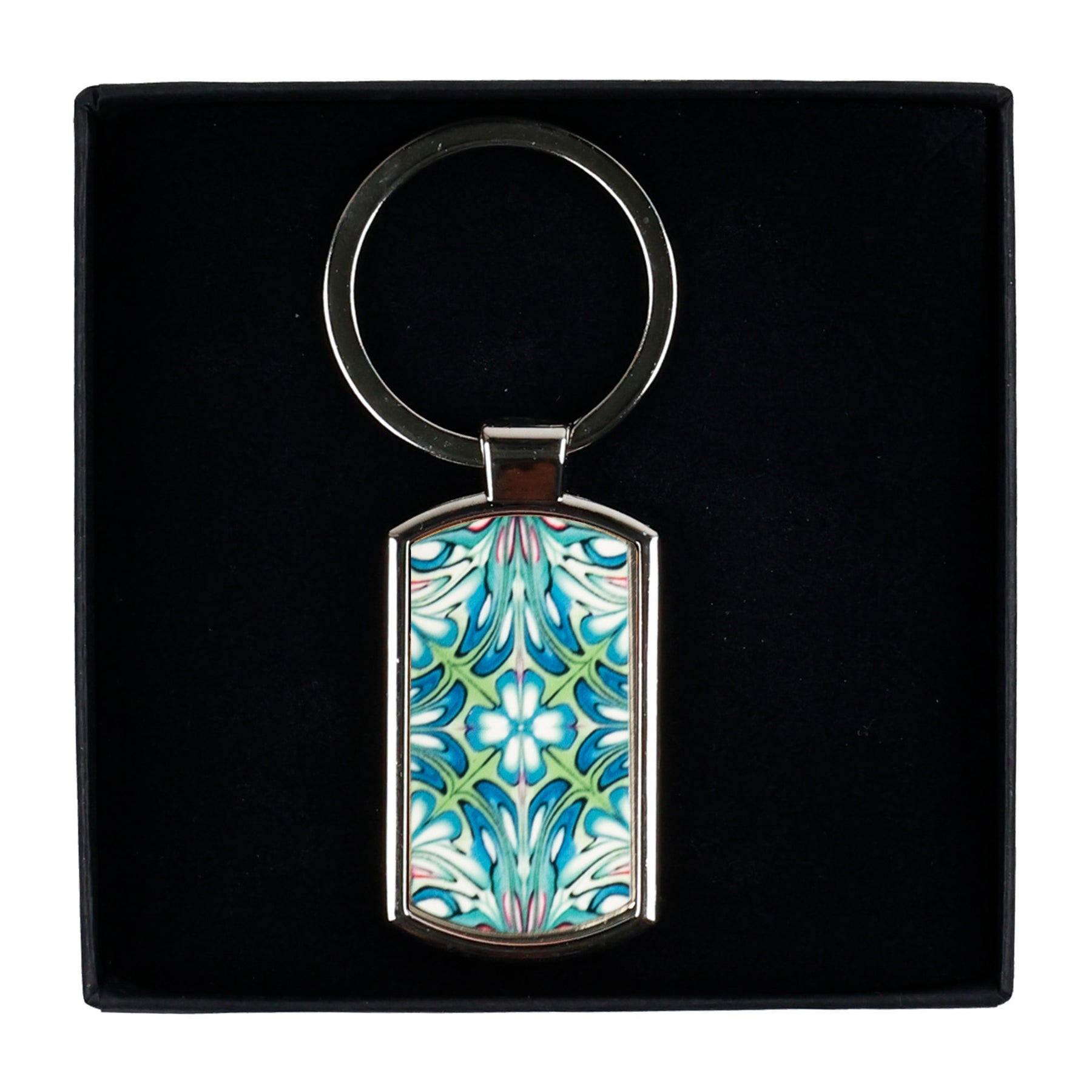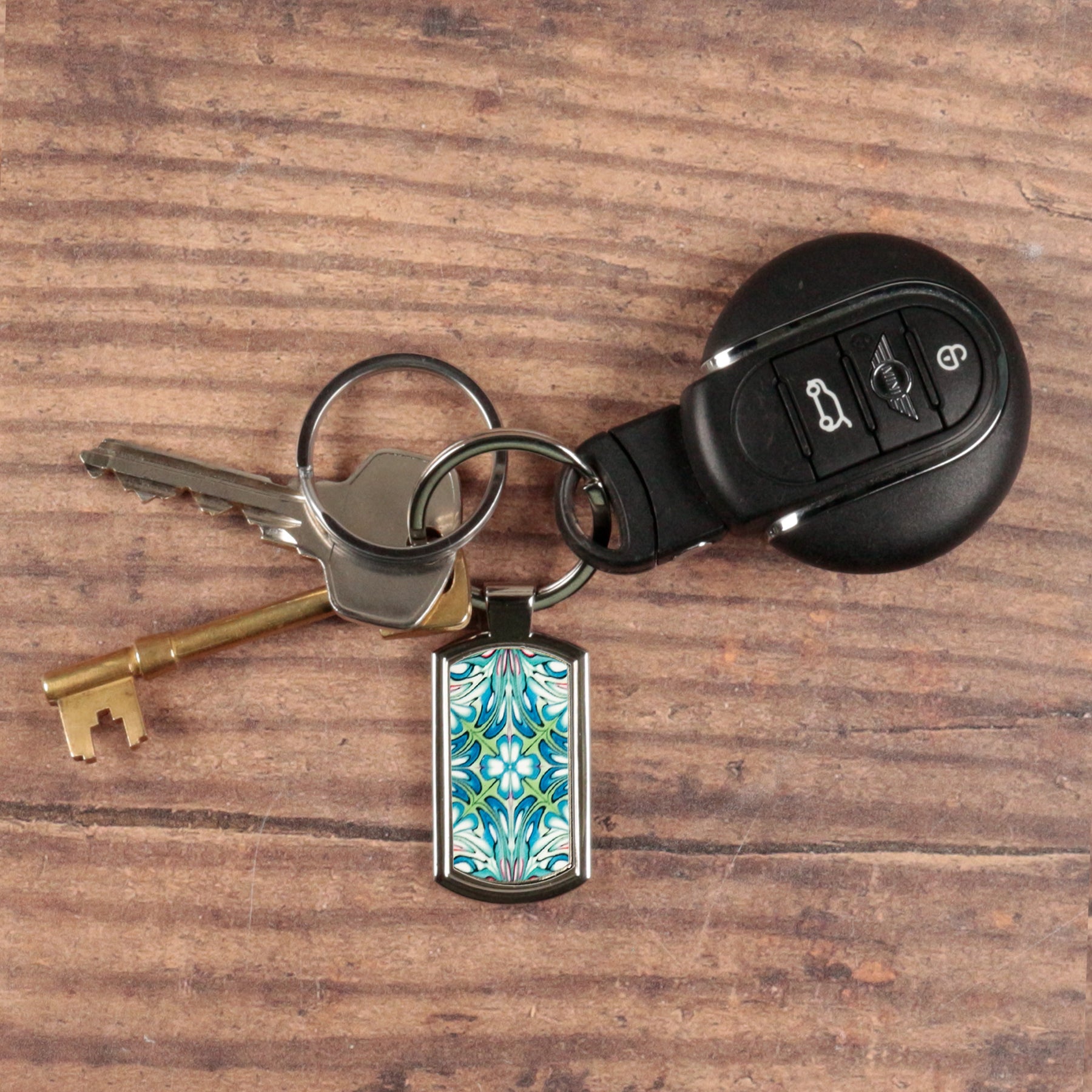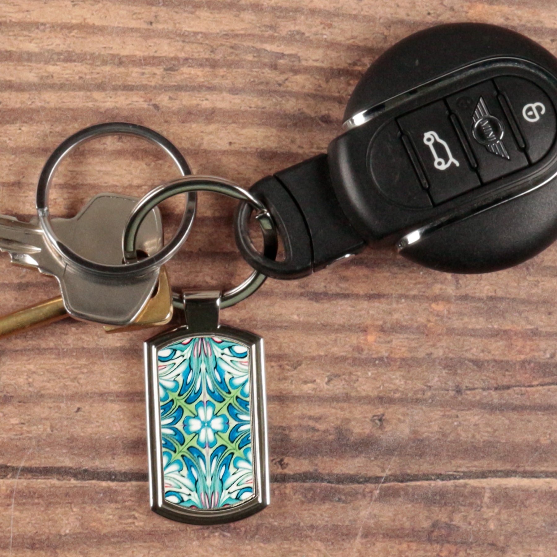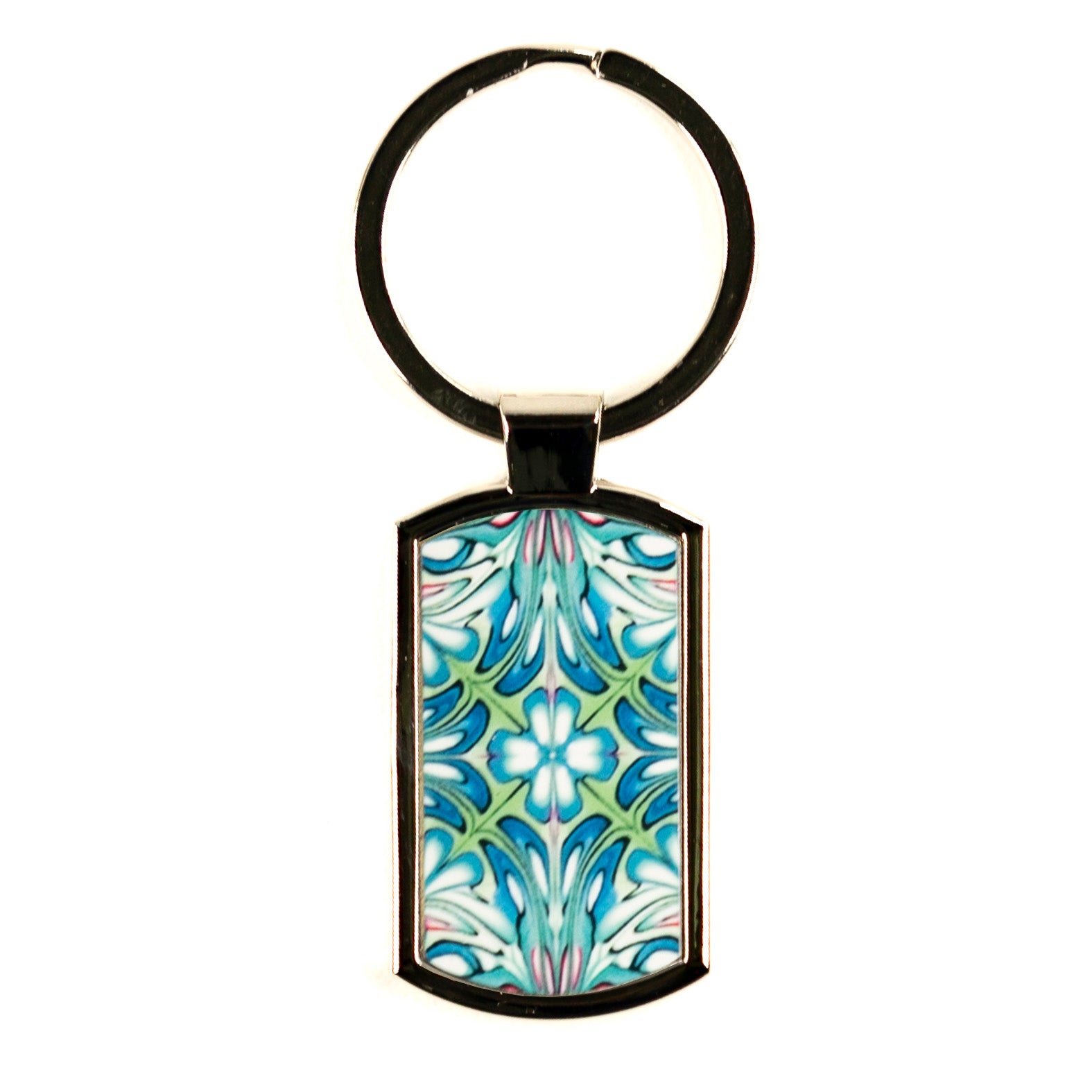 A high quality metal keyring with a beautiful millefiori print inlay. I call the design 'Flourishing Garden' because of its multitude of greens, blues, teals and a tiny pop of petal pink.
