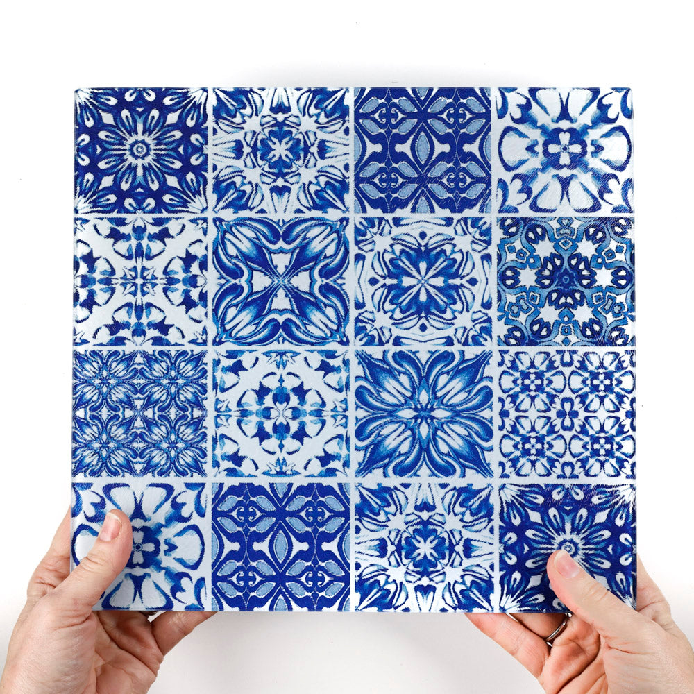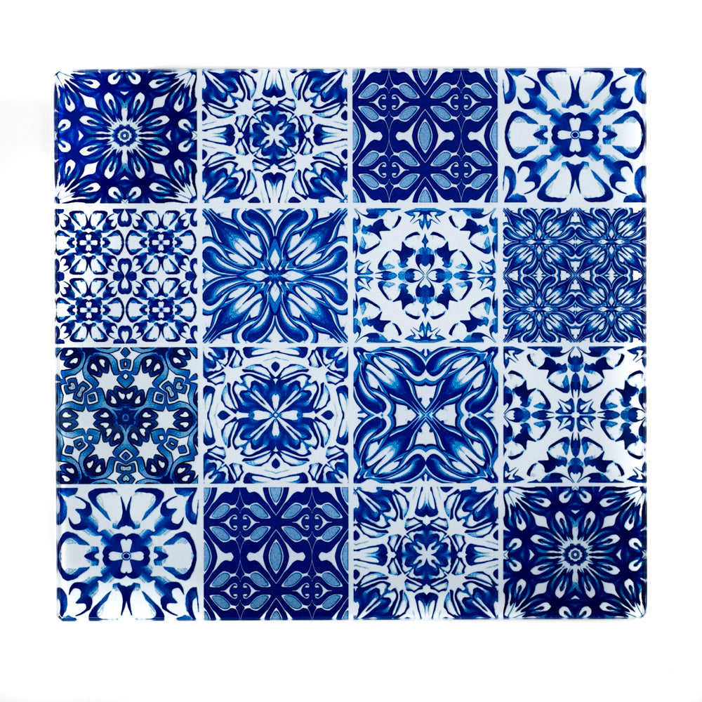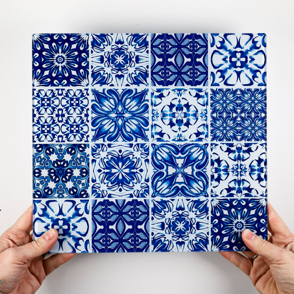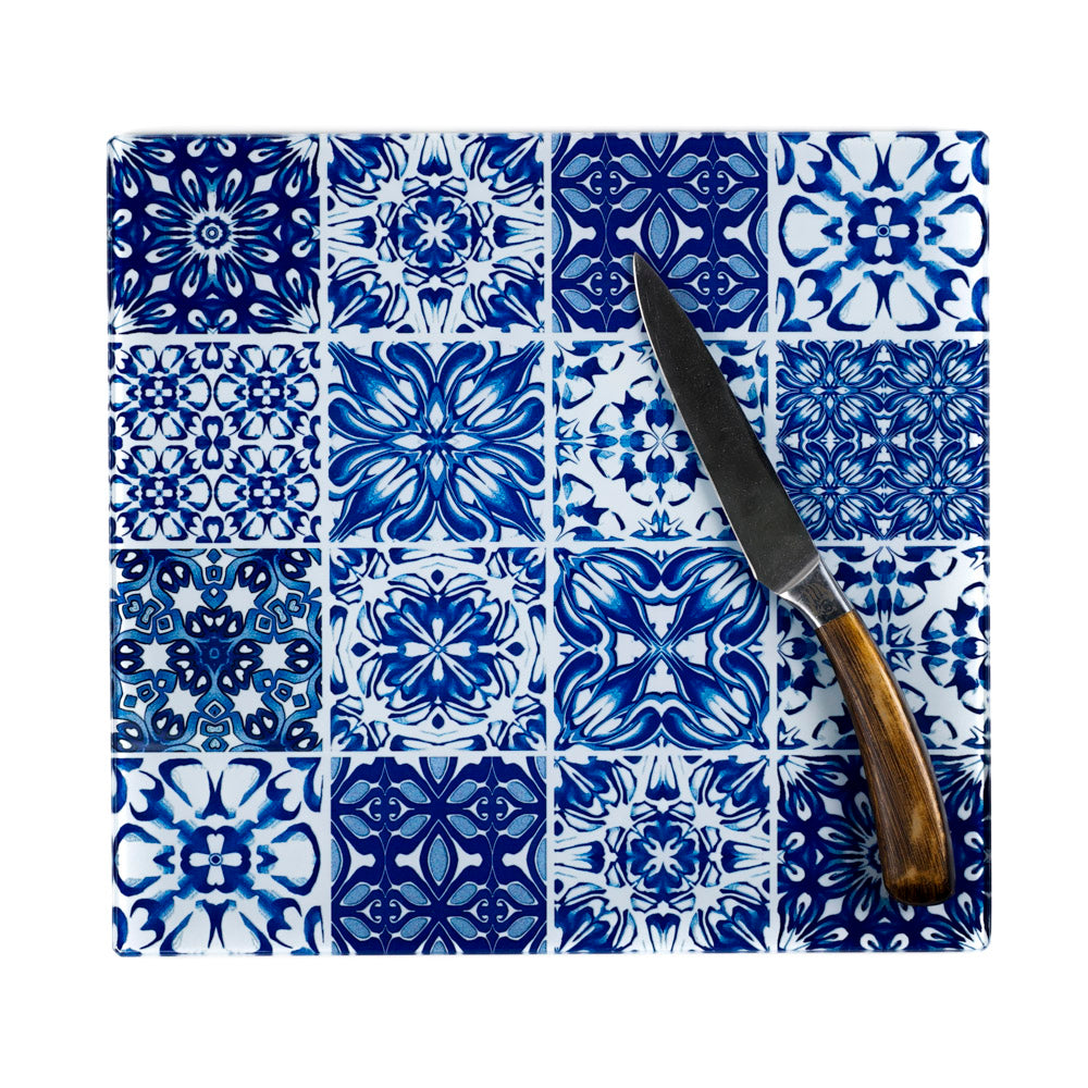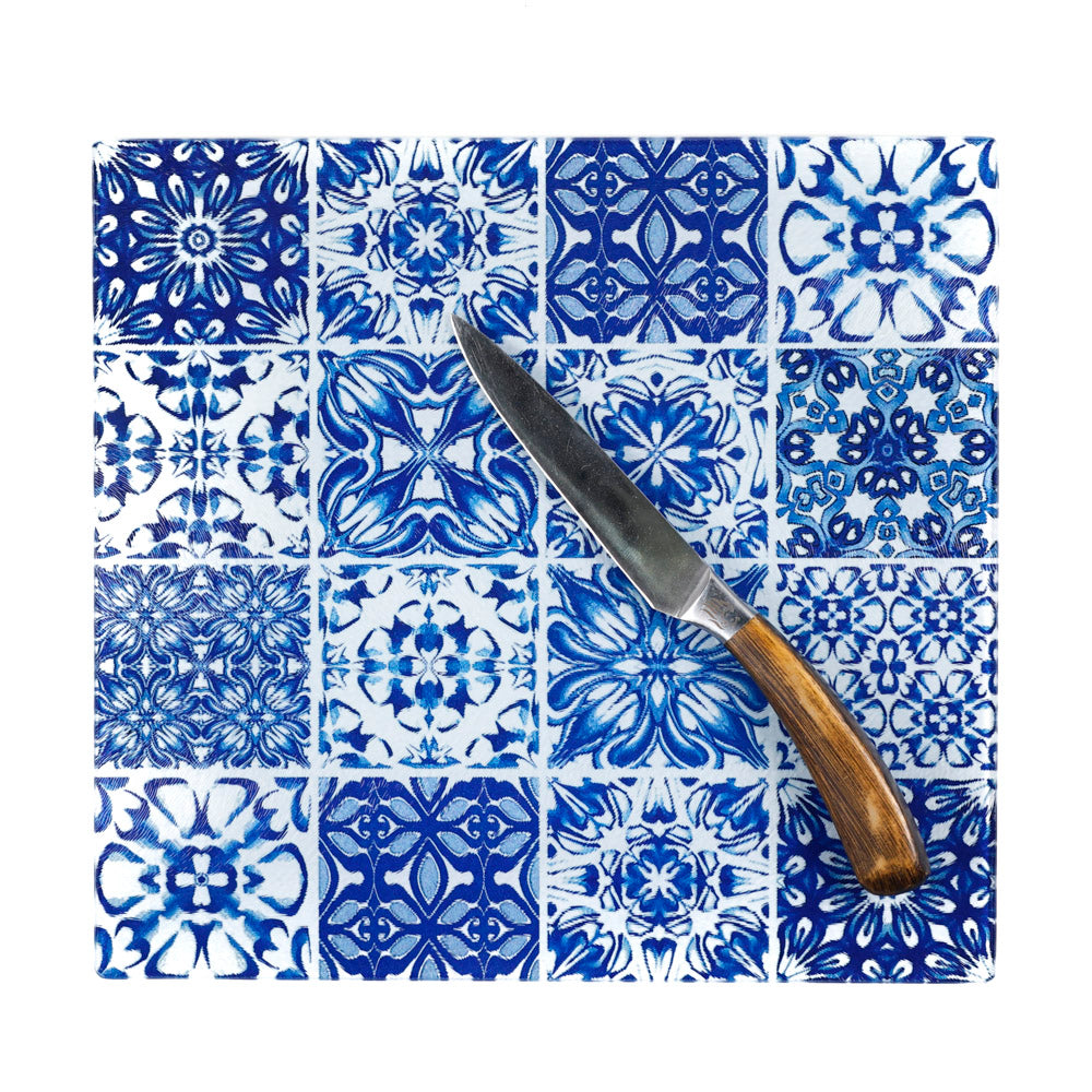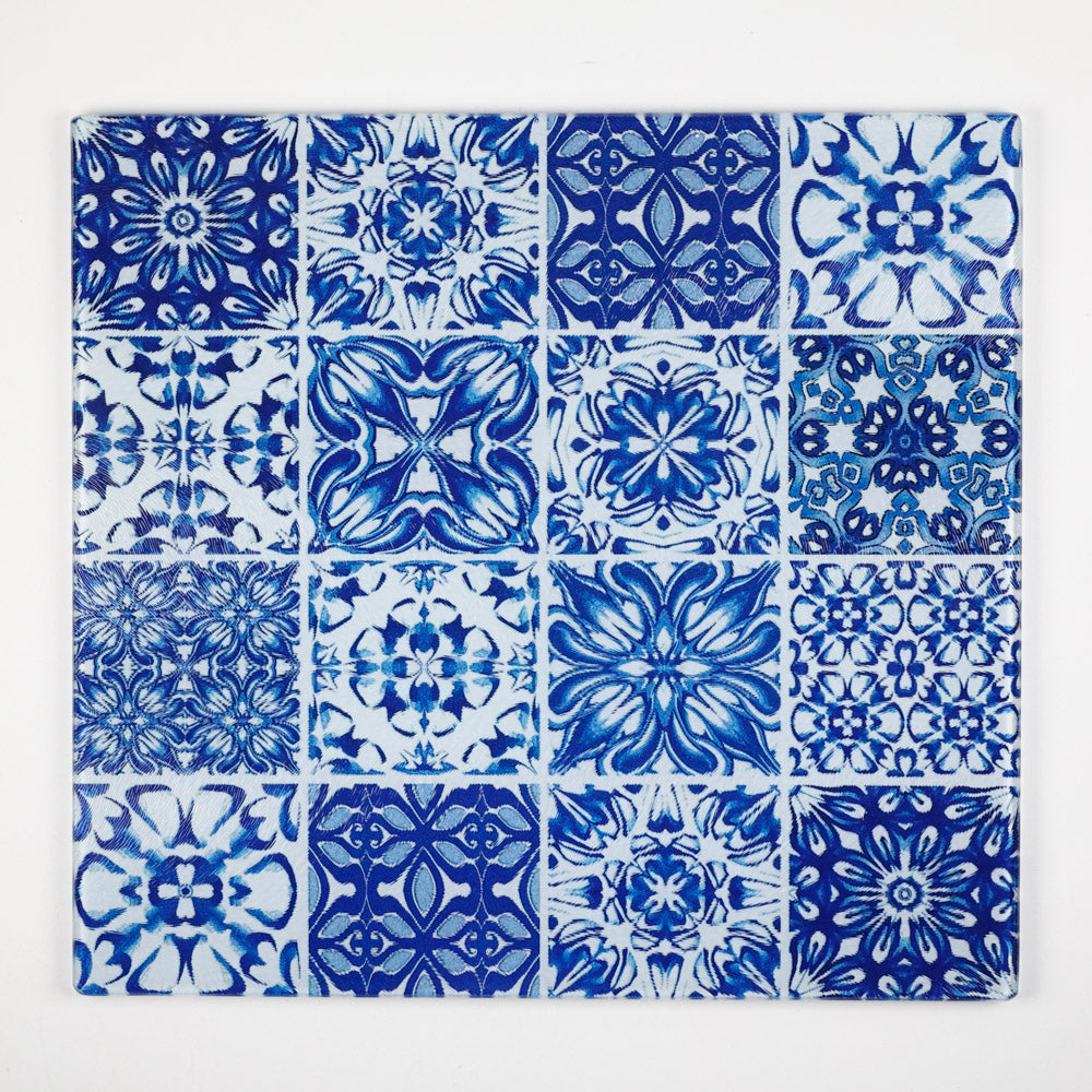 Lots of different blue and white 'tile' designs make up the pattern on this toughened heatproof chopping board - perfect to keep by the side of your stove to put down hot pans, chop vegetables, or even serve food.