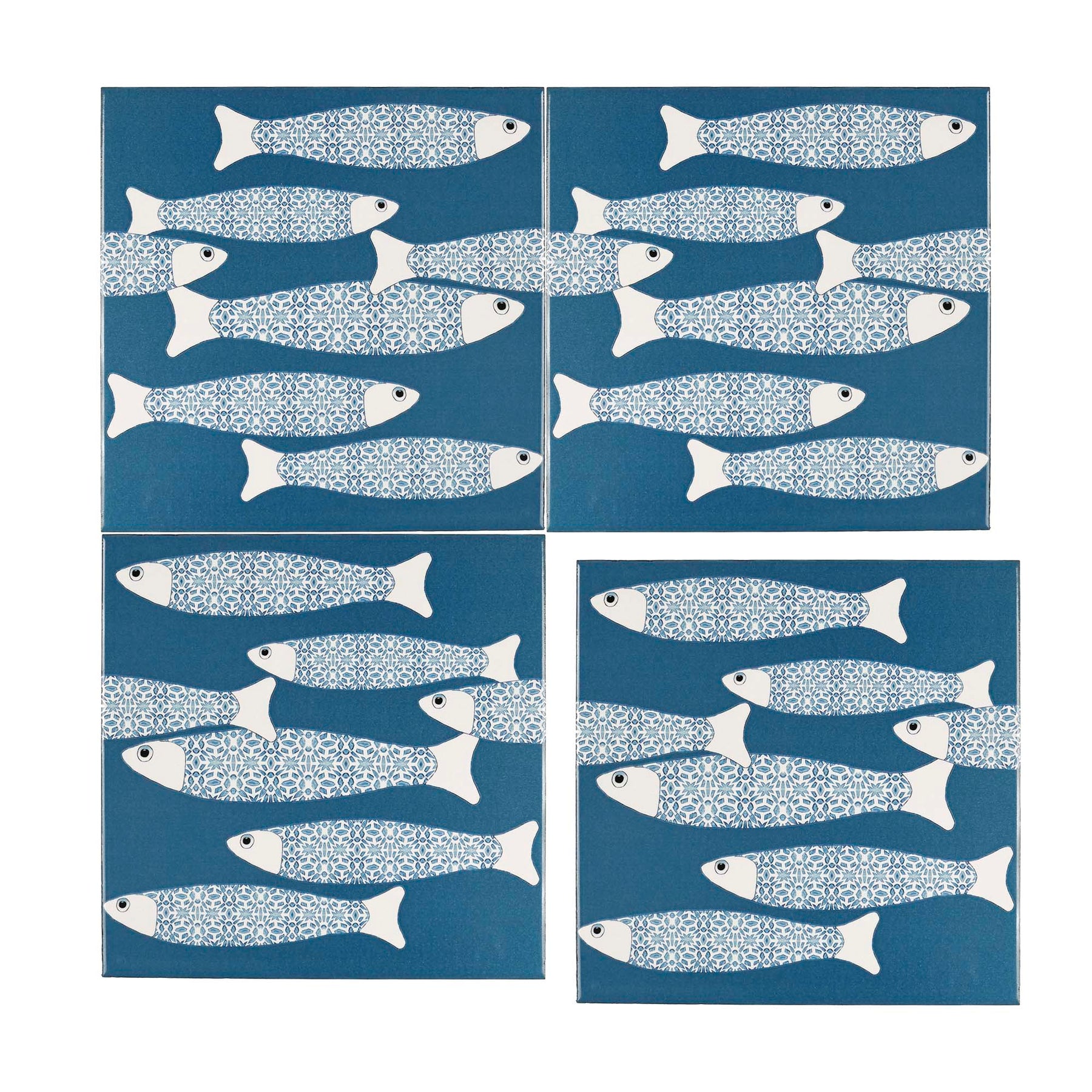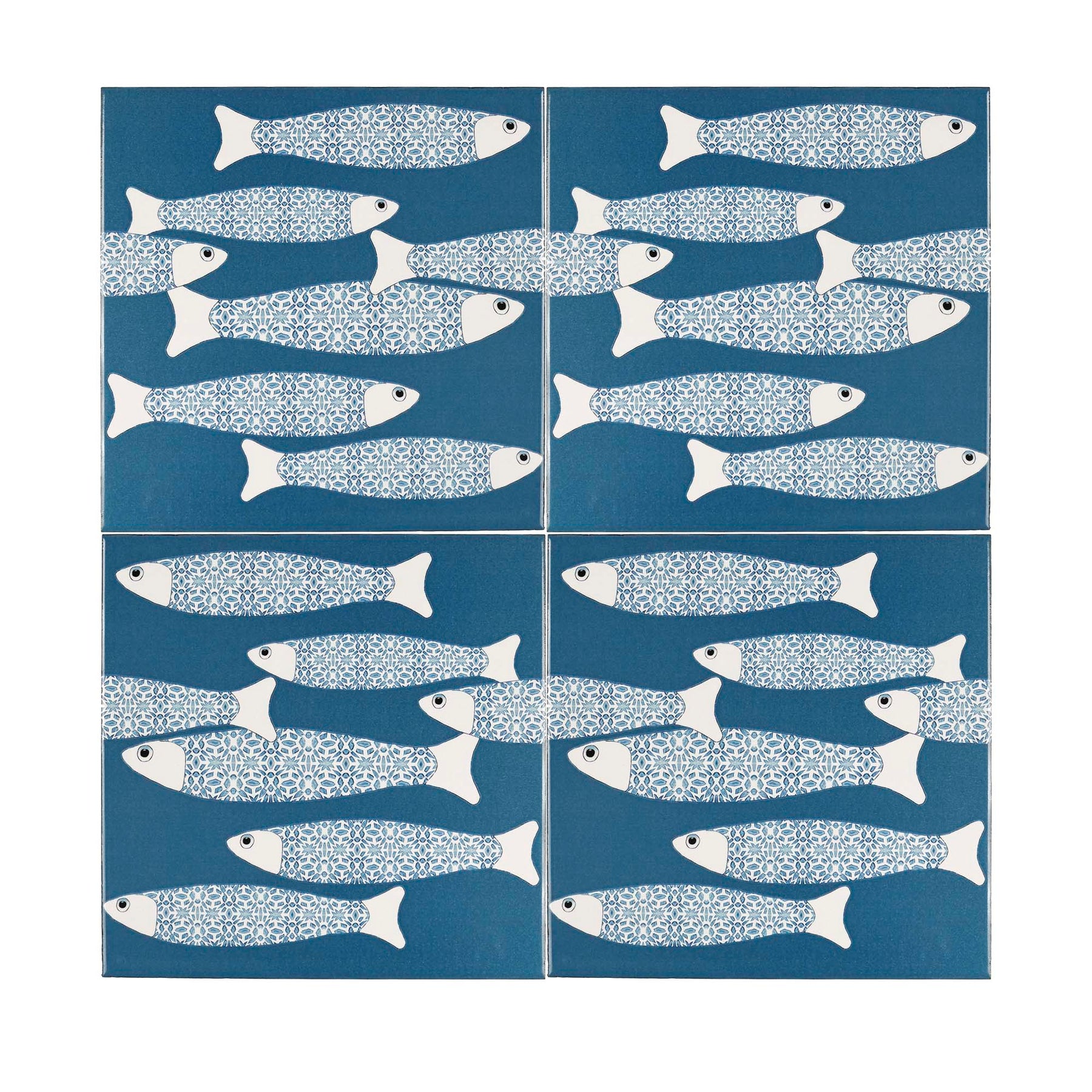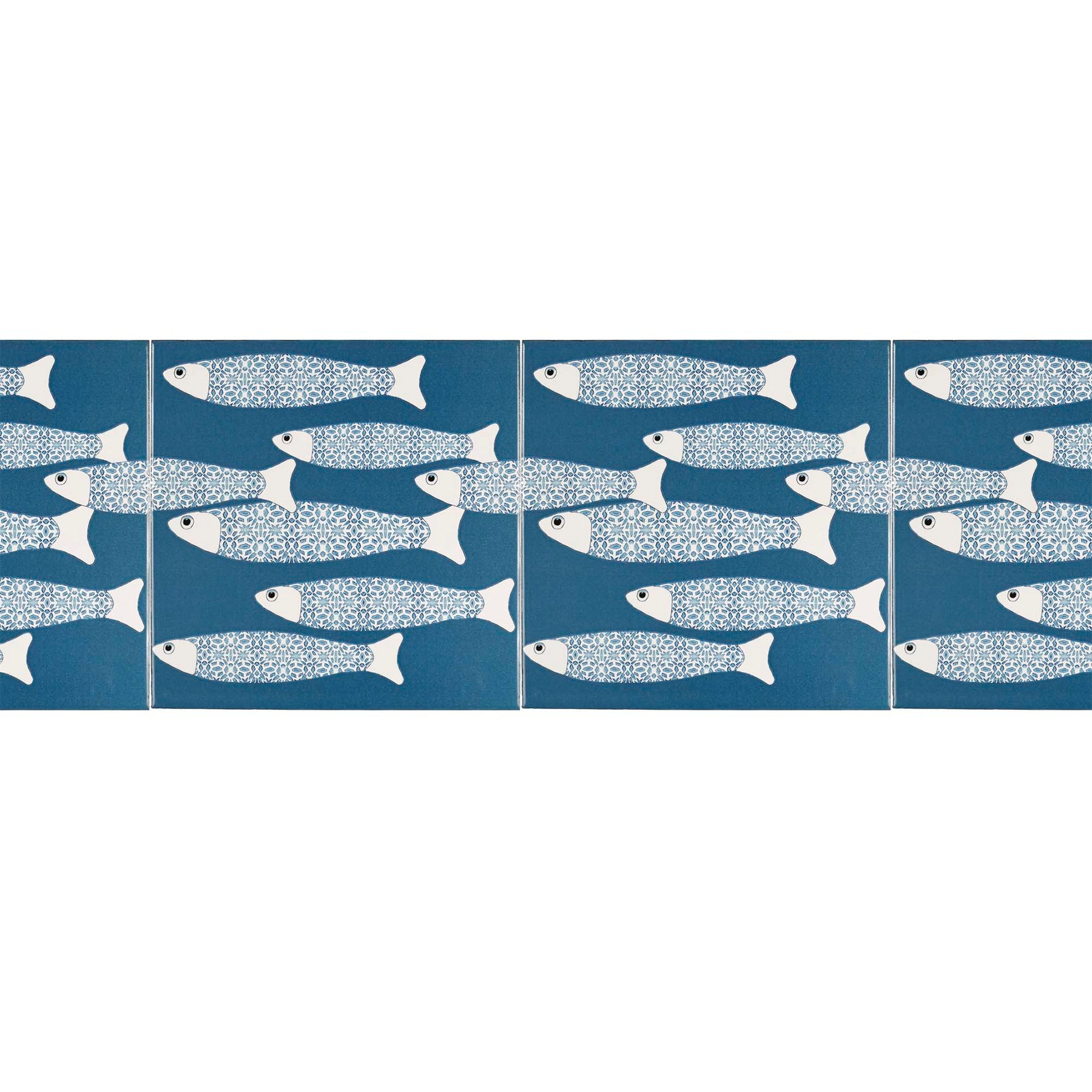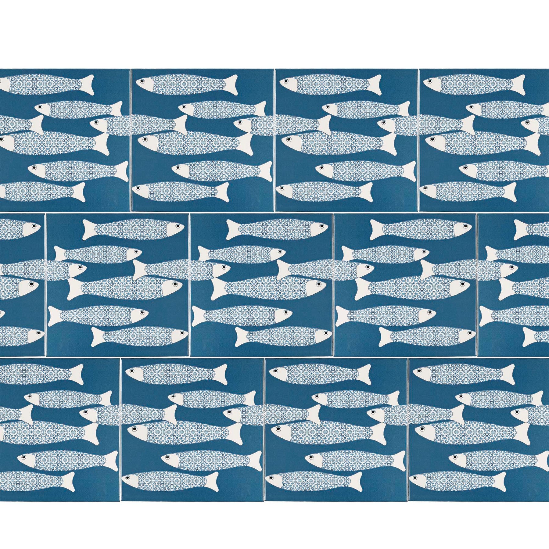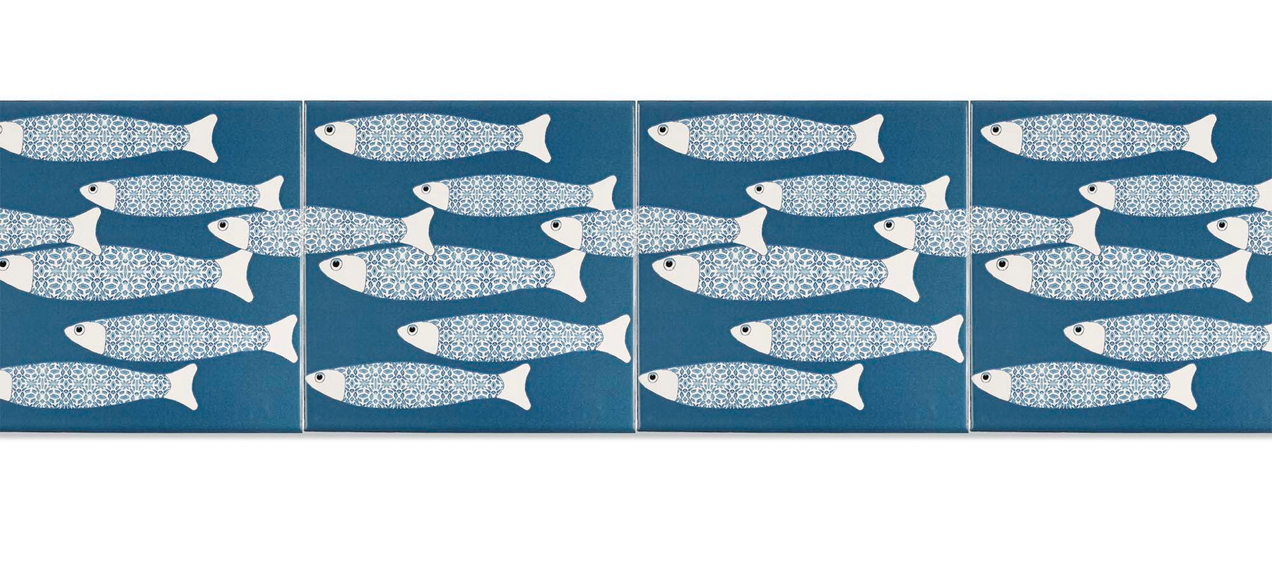I call these tiles 'Ocean School' - large millefiori-patterned fish stream across the tiles in a pattern that repeats seamlessly across the wall, or around your bath! They're available in several colours - this is the new teal colourway.