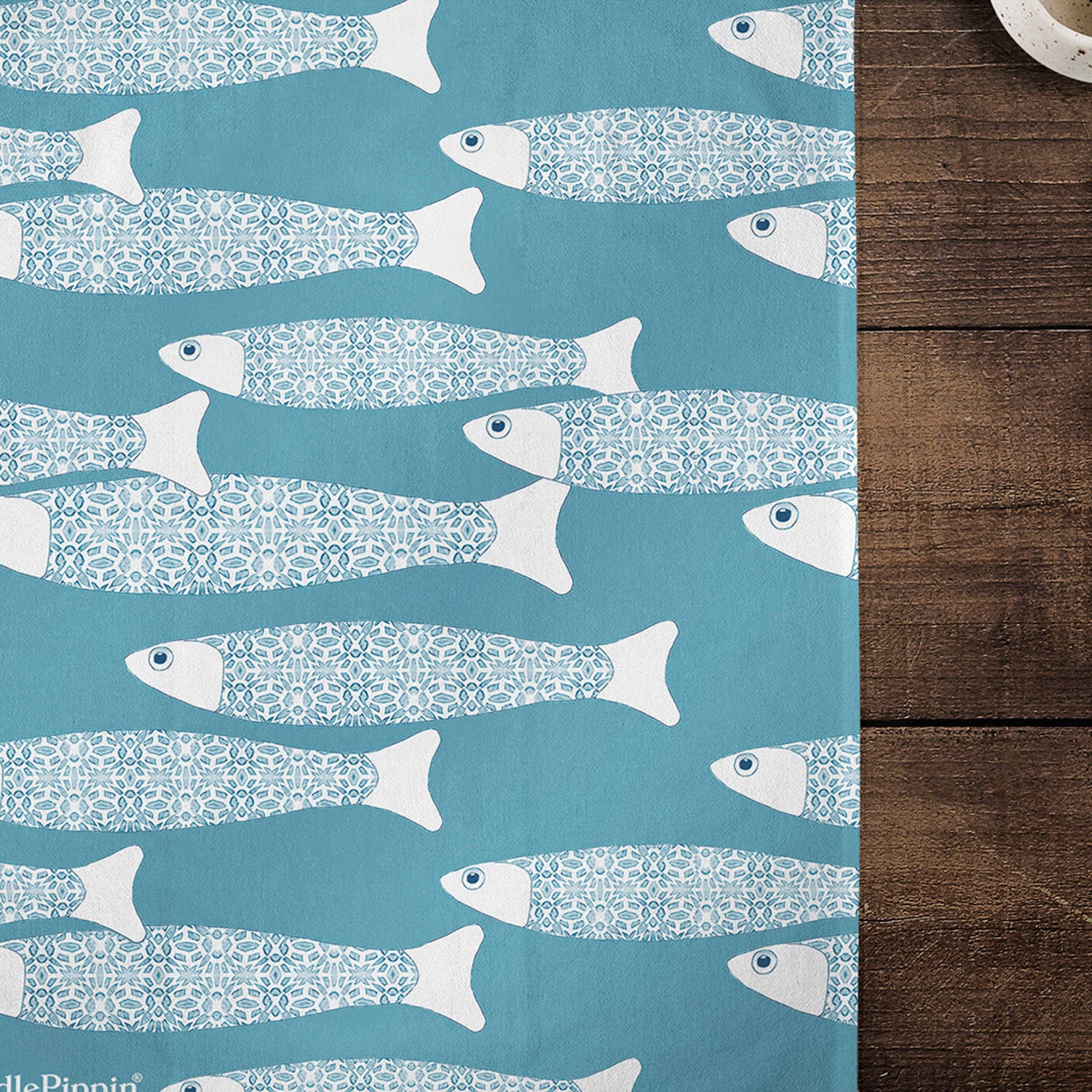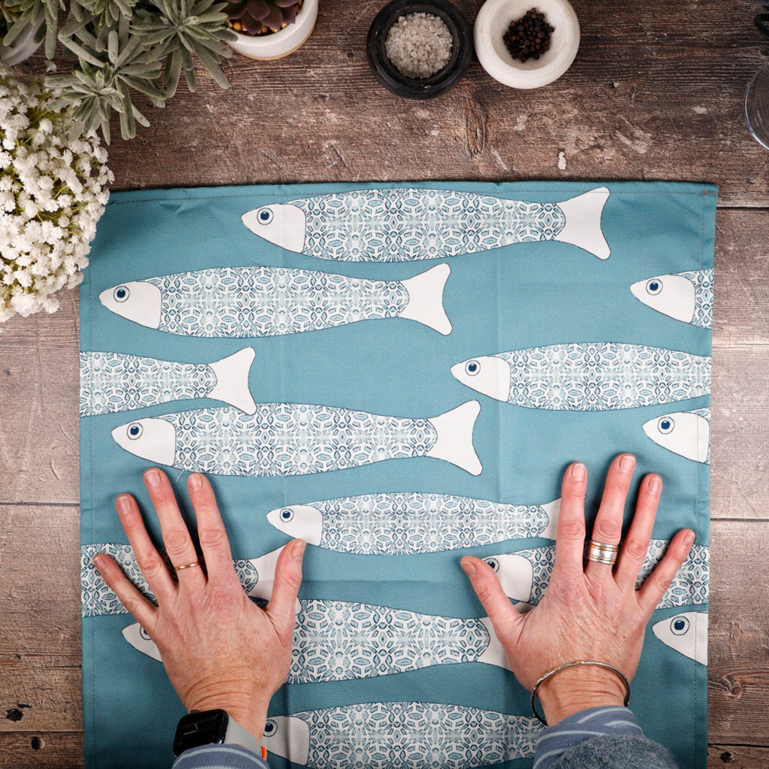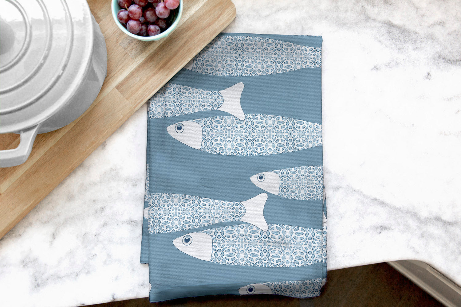 Add a bit of fun and personality to your kitchen with this lovely grey-blue tea towel, featuring a shoal of millefiori-patterned fish.