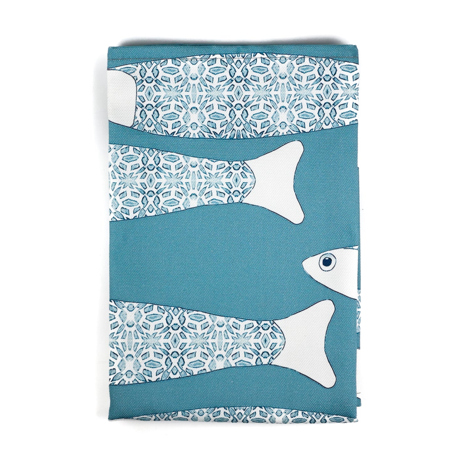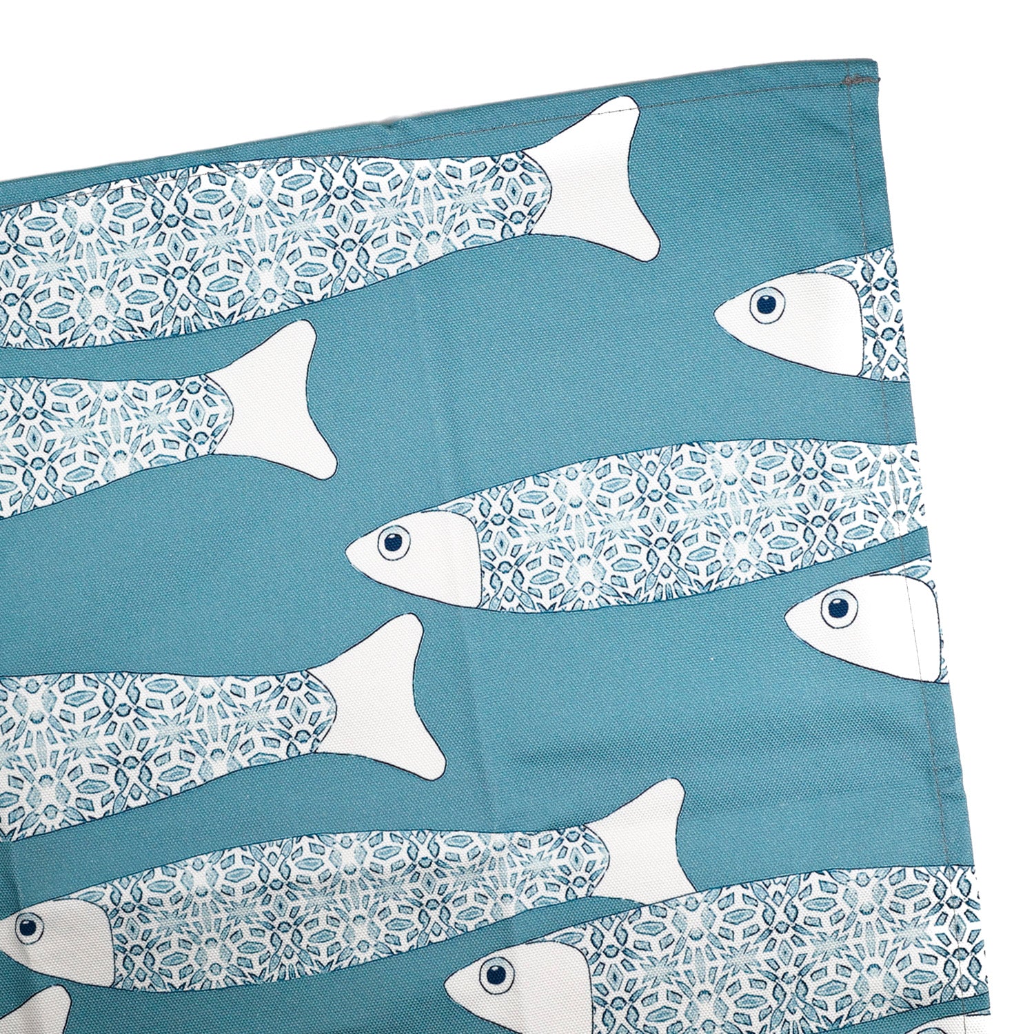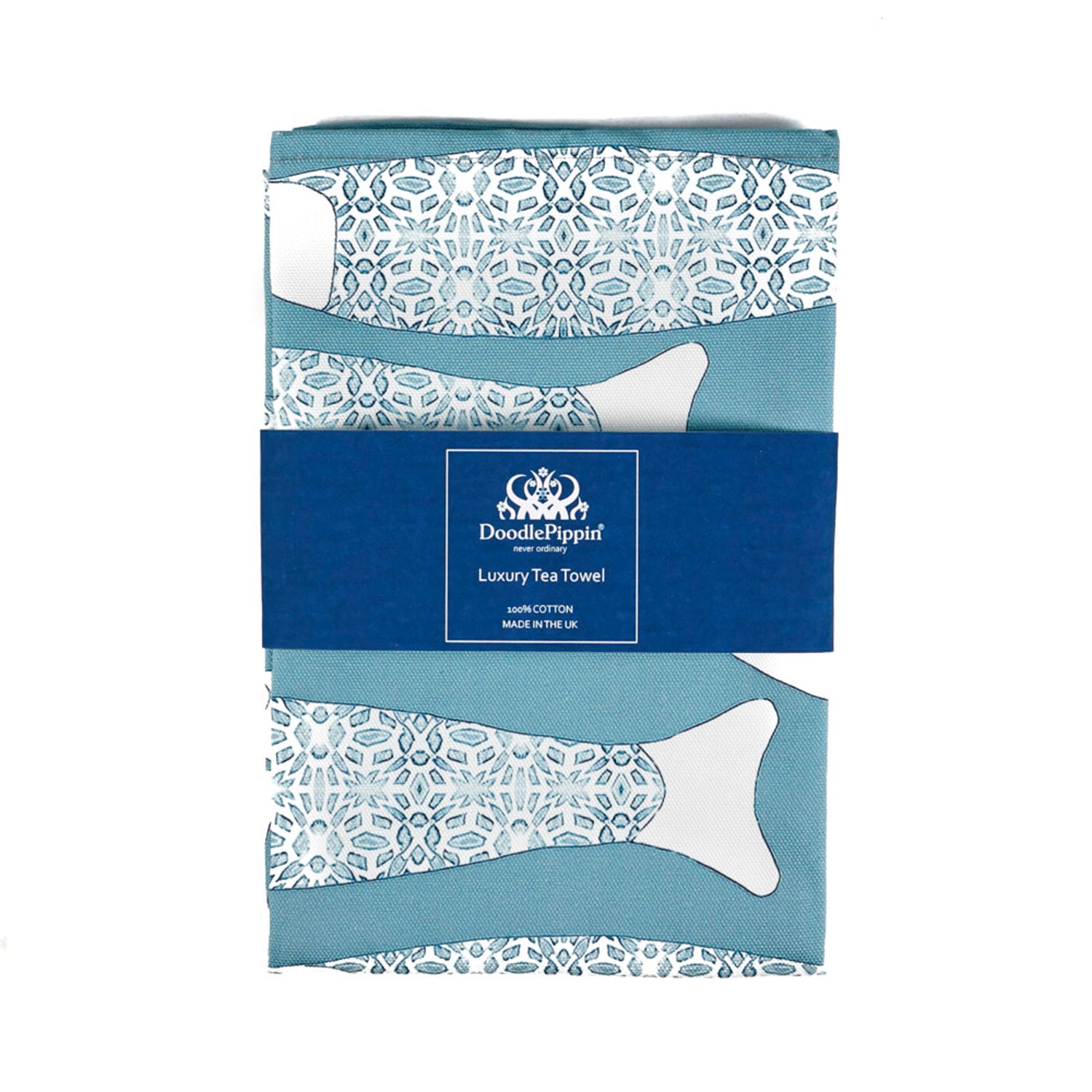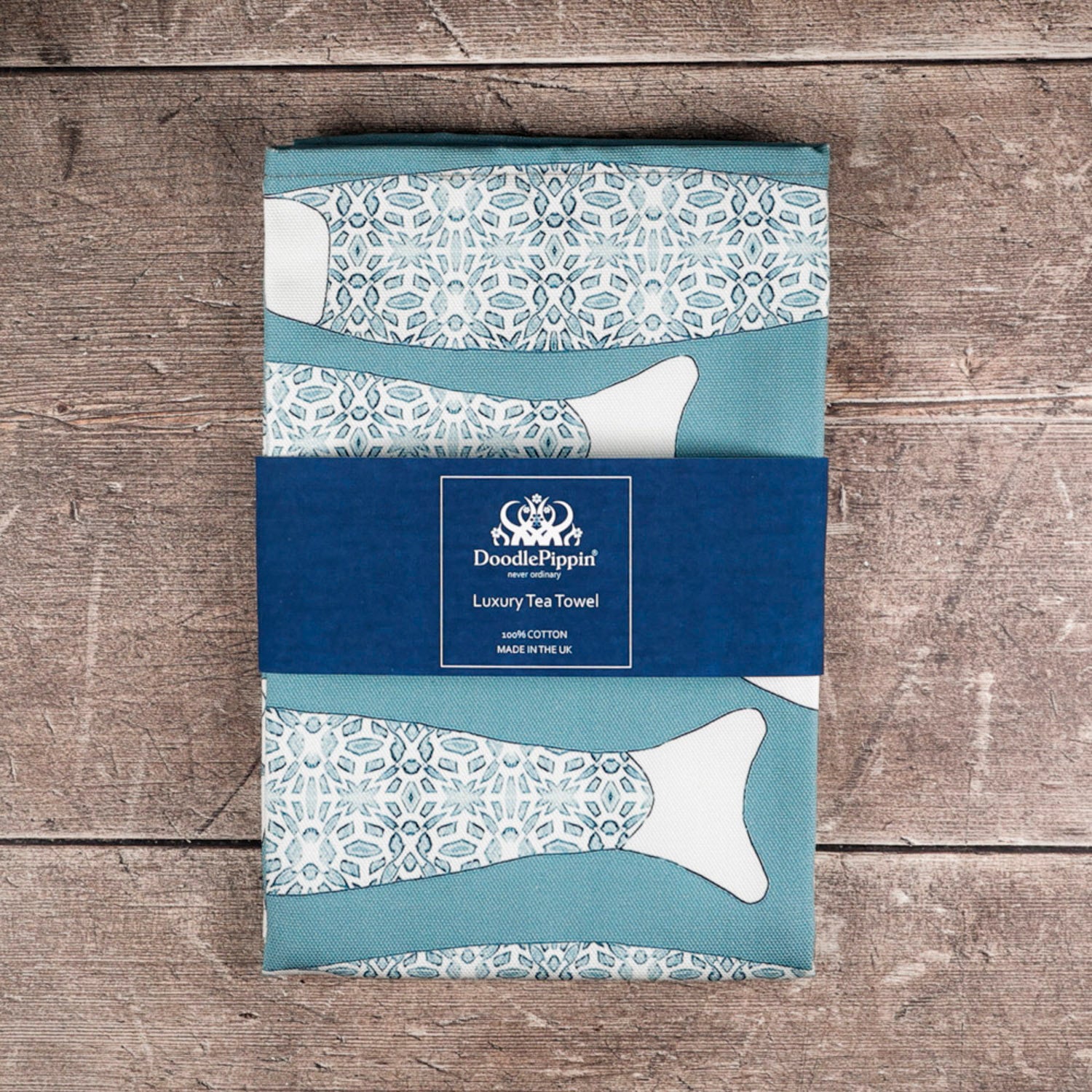 Add a bit of fun and personality to your kitchen with this lovely grey-blue tea towel, featuring a shoal of millefiori-patterned fish.