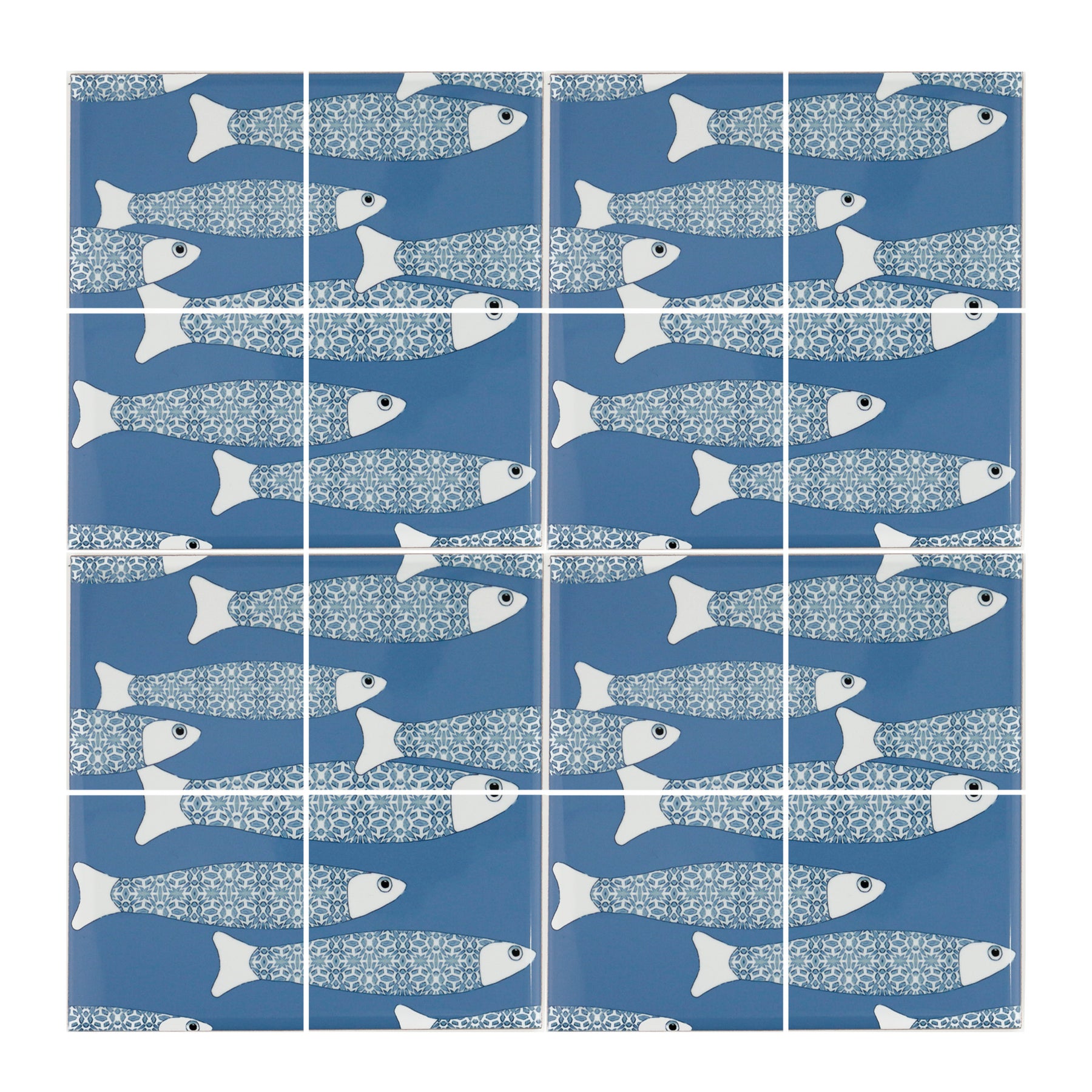 These unique tiles feature a pretty grey blue pattern that forms the scales of the fish while the background is a lovely mid-blue.