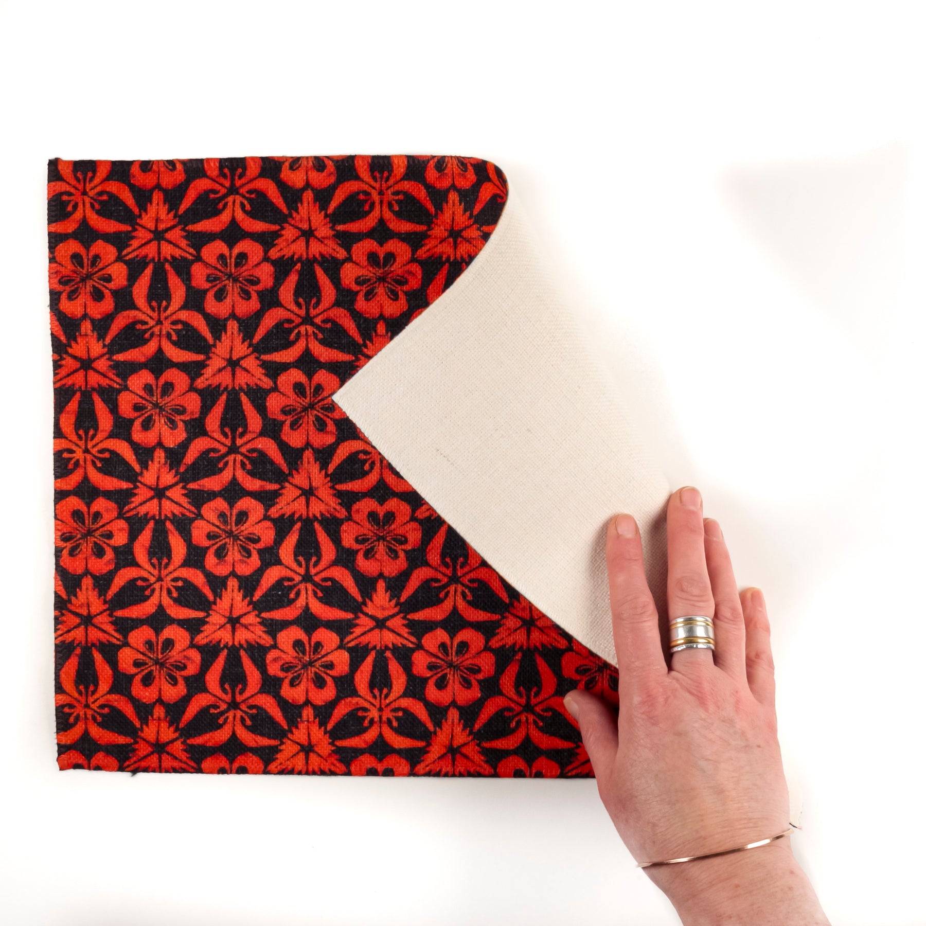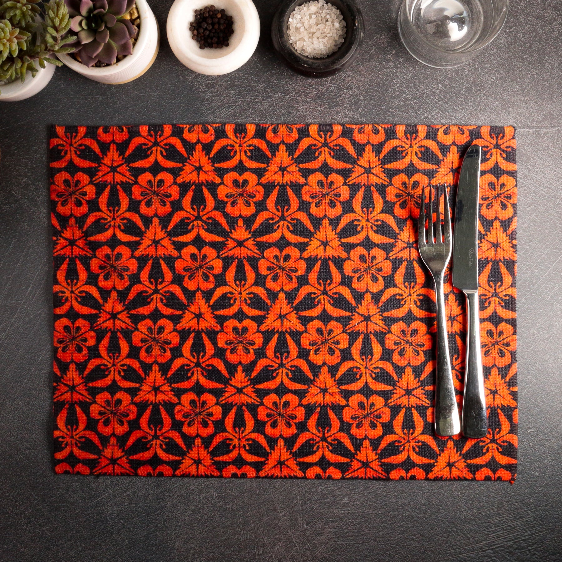 A striking orange-red and dark grey original millefiori design, on machine washable linen-feel canvas place mats.