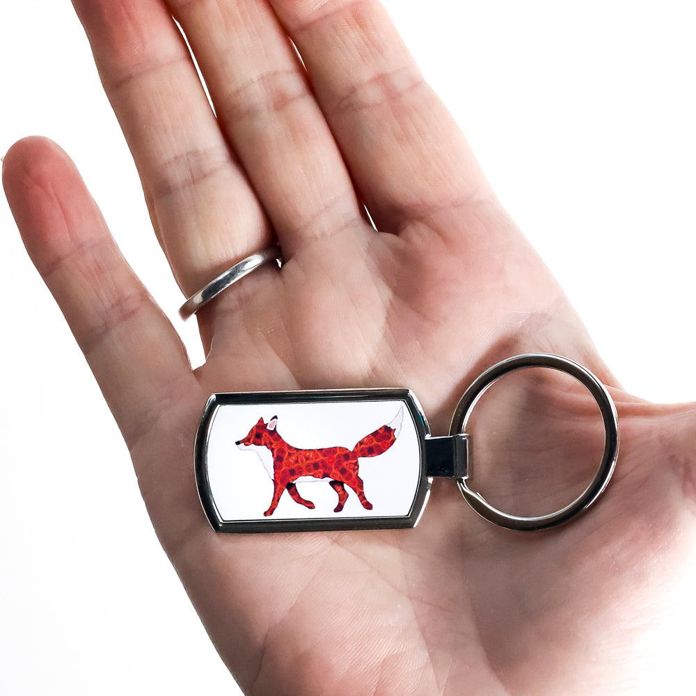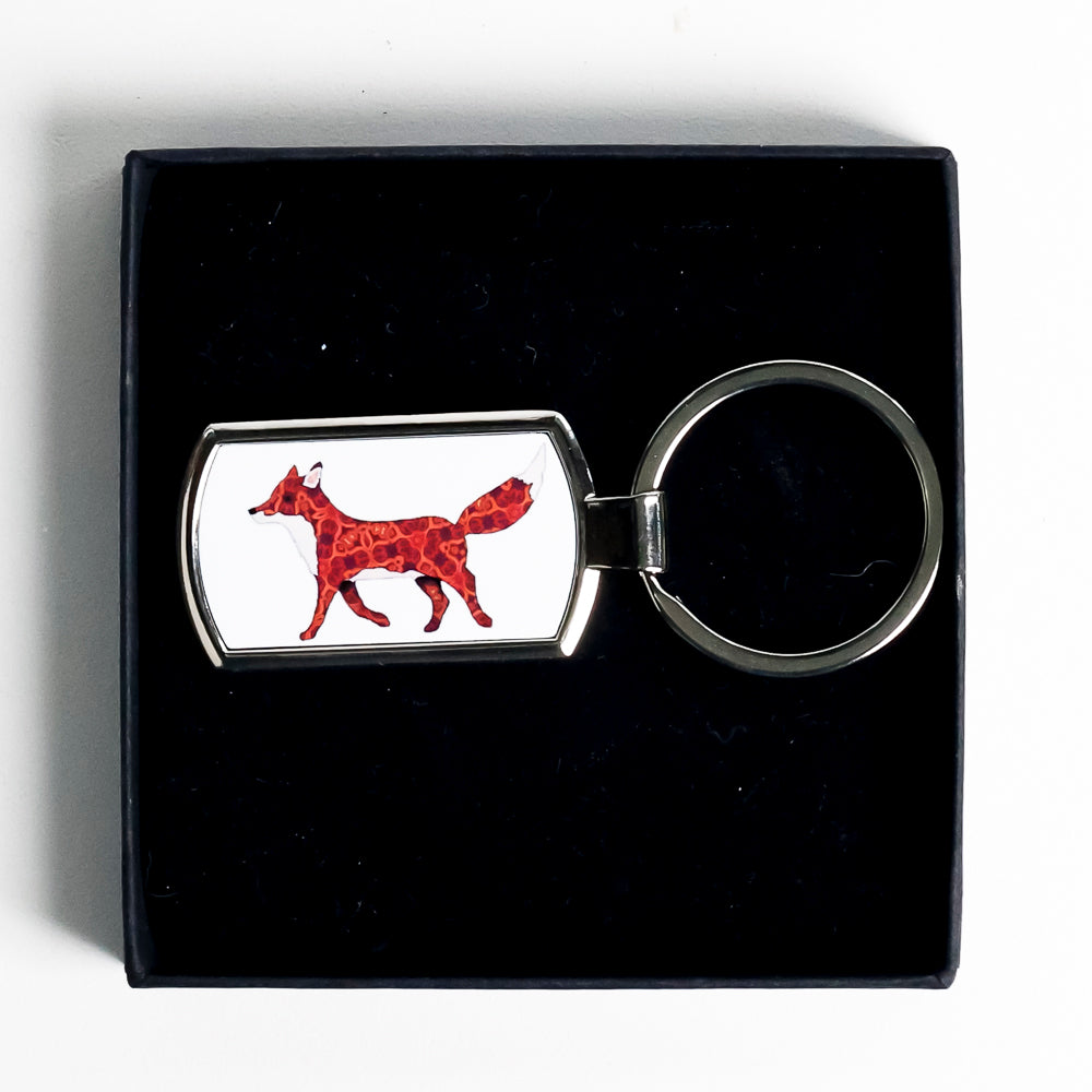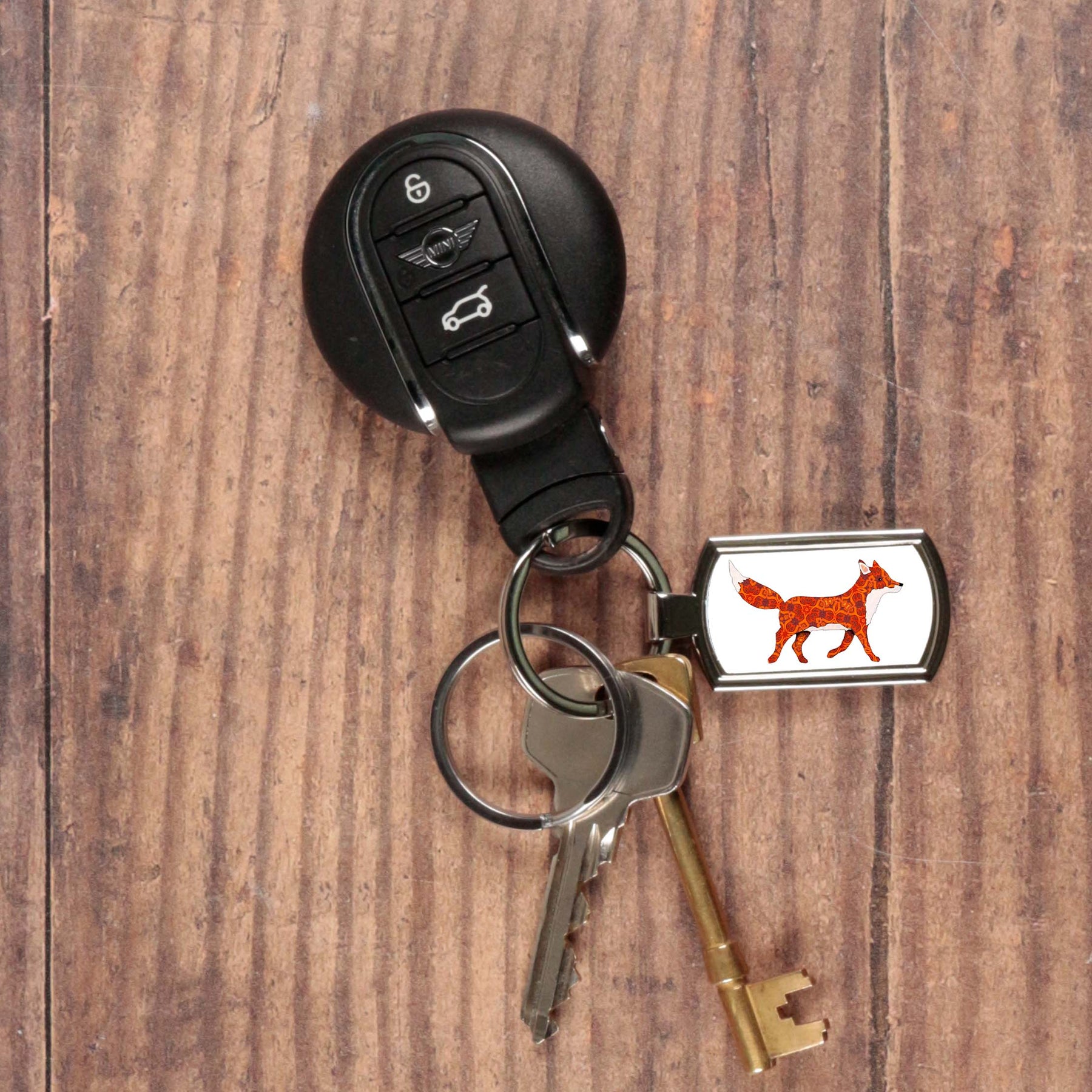 A high quality metal keyring with a beautiful millefiori print inlay featuring a bright orange fox on a white background.