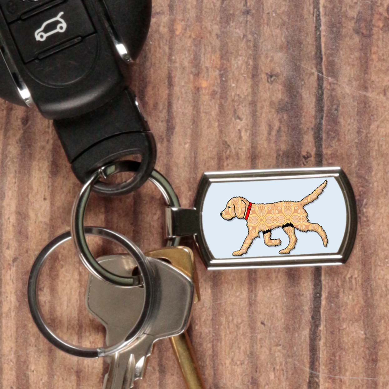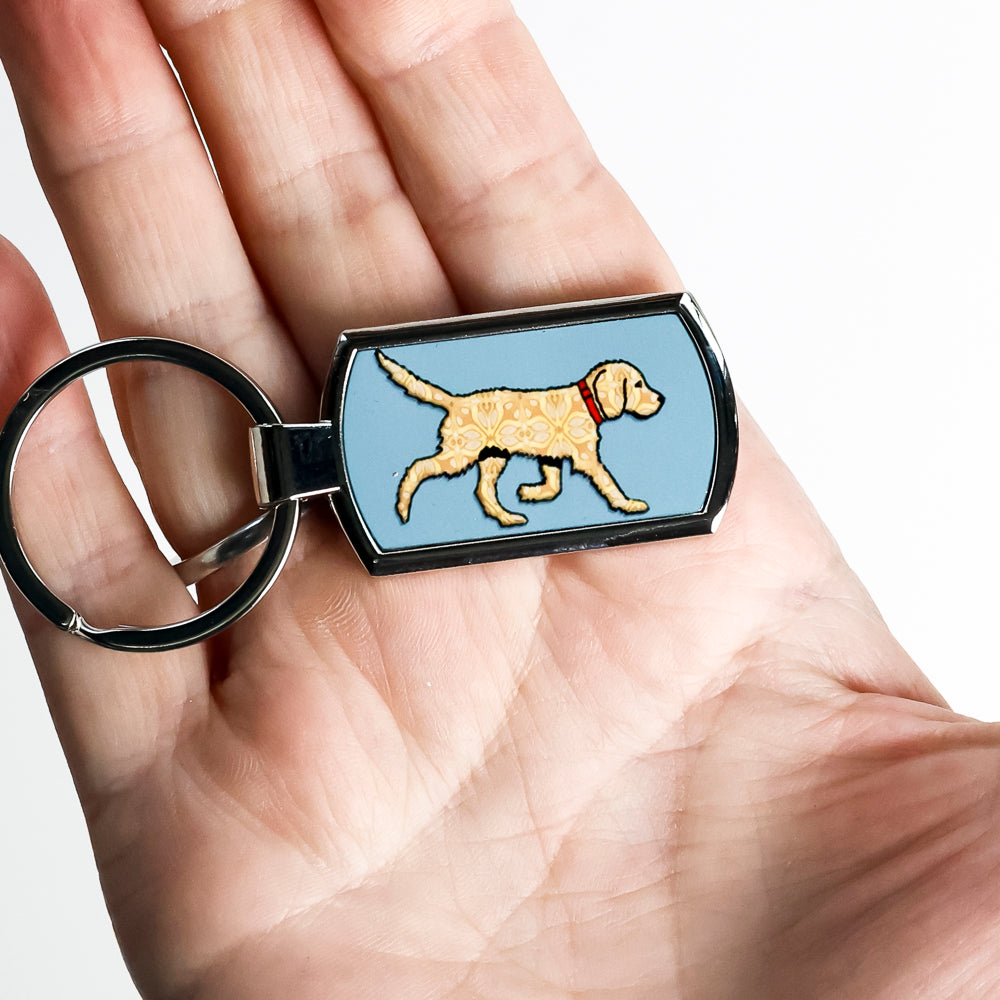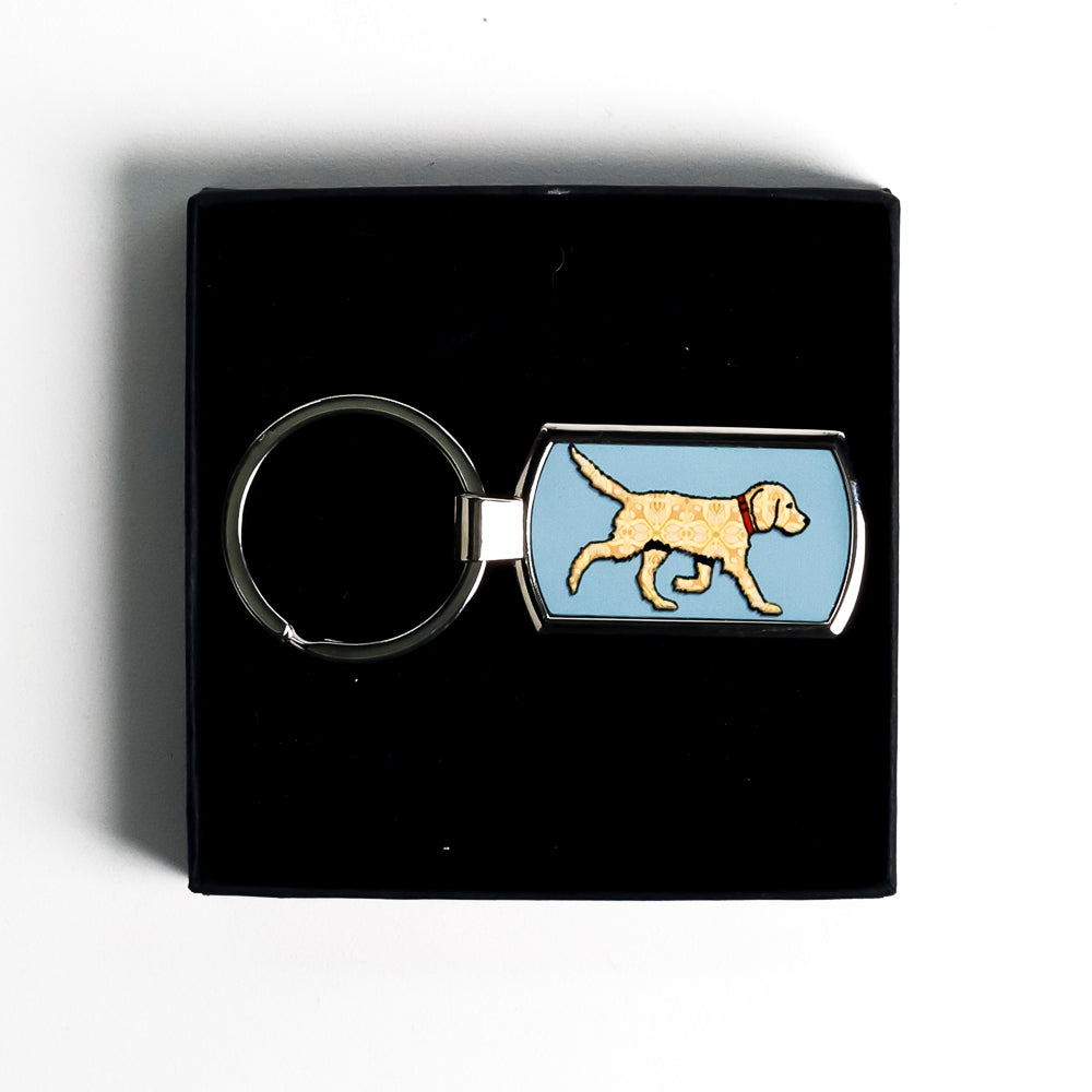 A high quality metal keyring with a beautiful millefiori print inlay featuring a striding golden labradoodle/labrador dog on a grey/blue background.