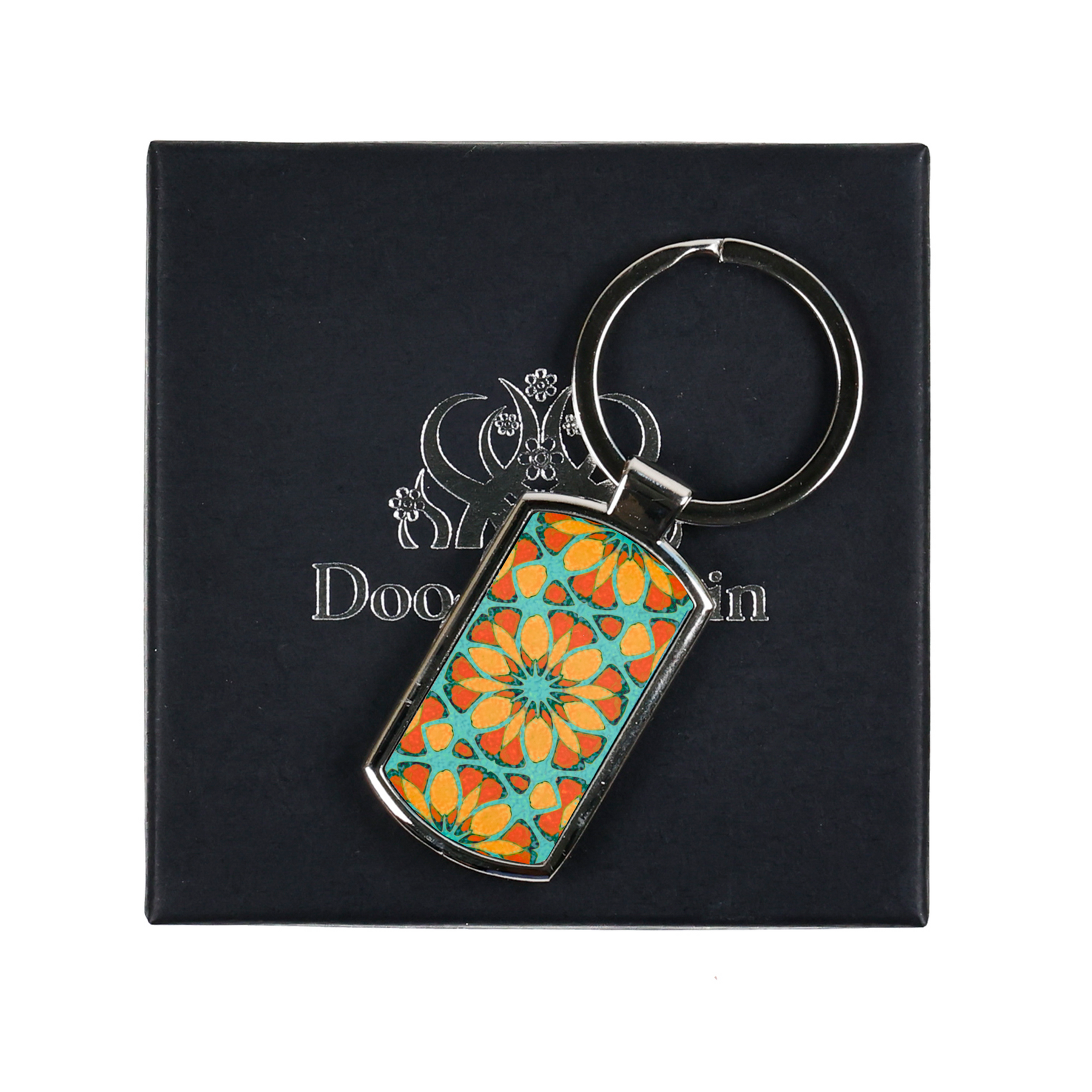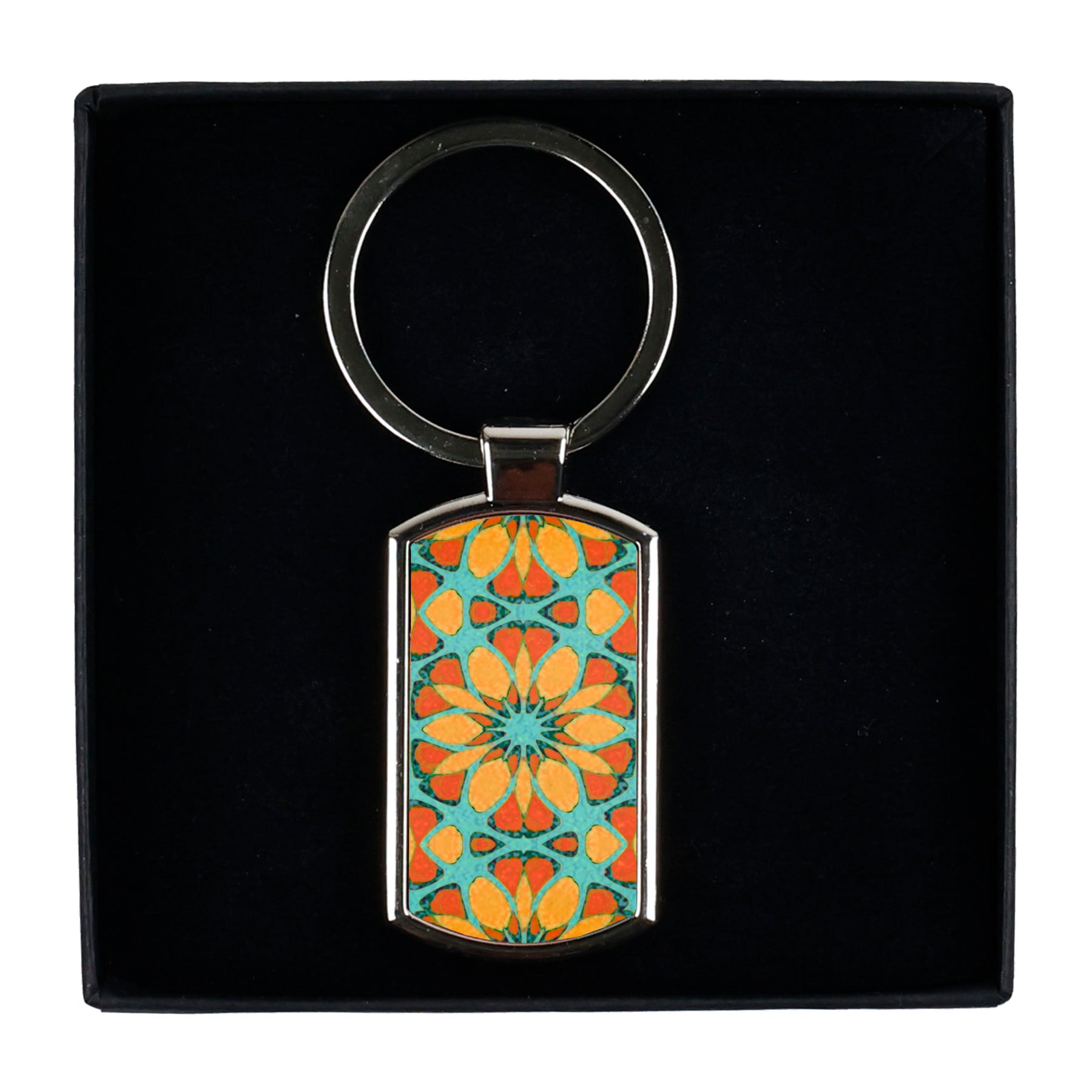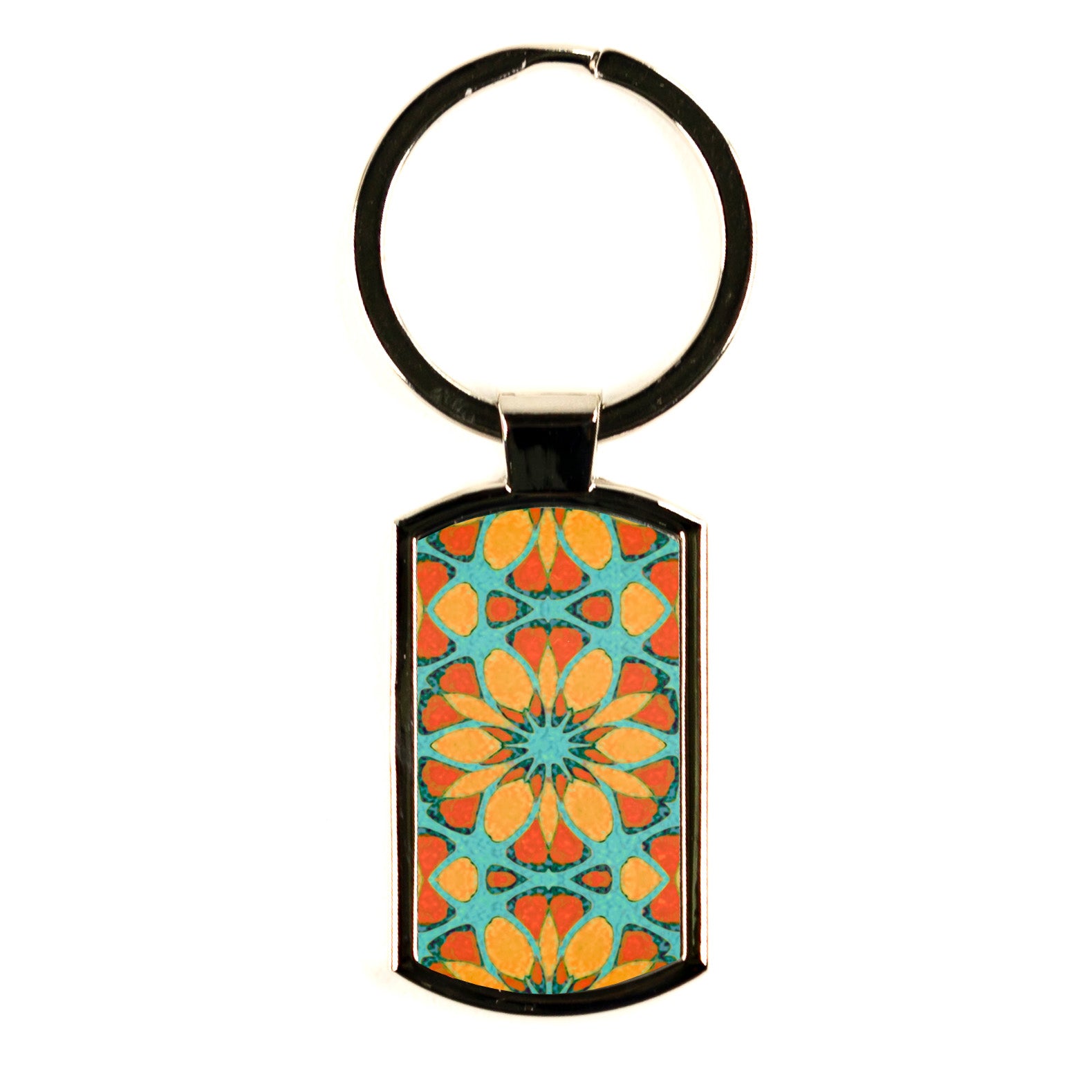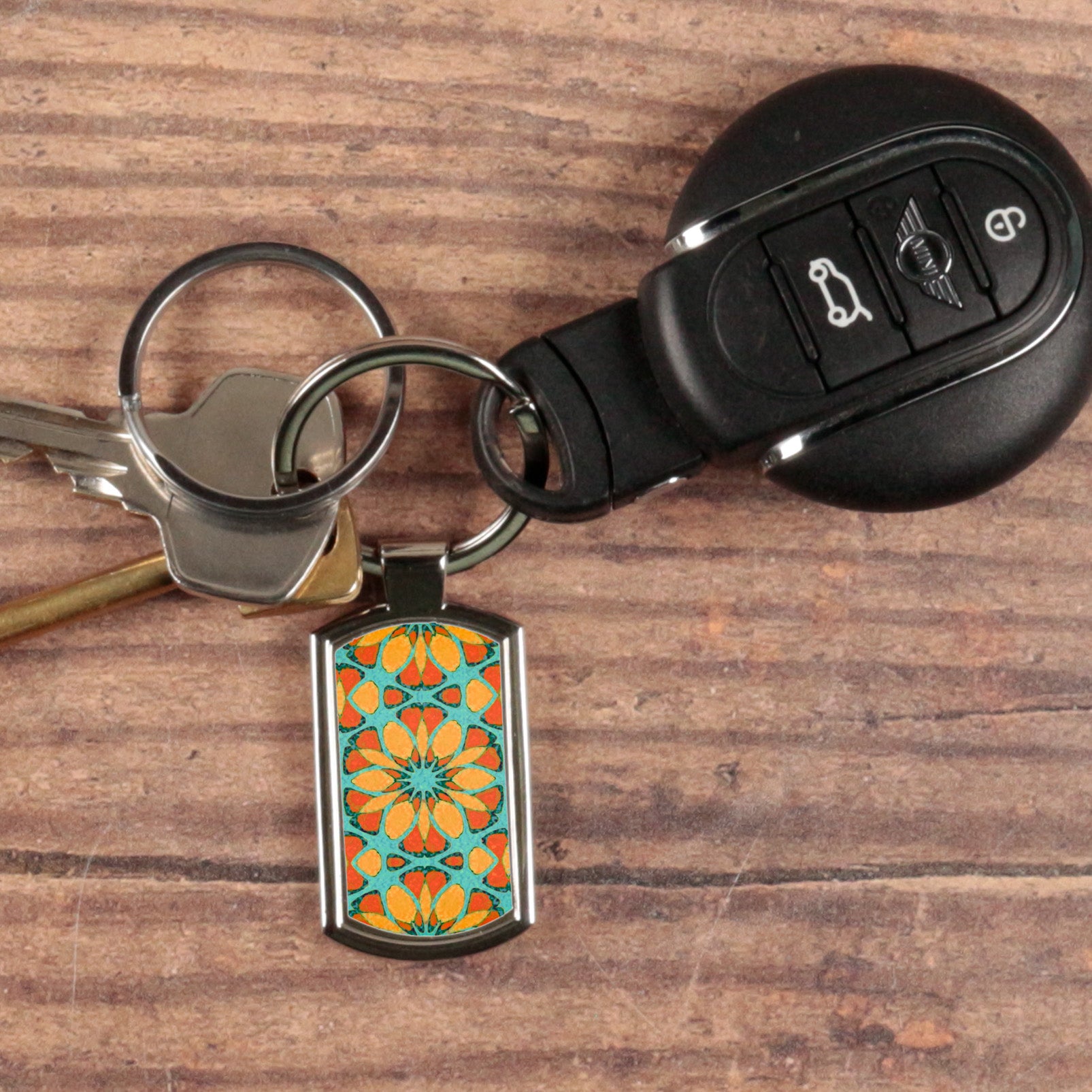 A high quality metal keyring with a beautiful millefiori print inlay. This is Moroccan Flower - a lovely combination of oranges, reds and teal blue.