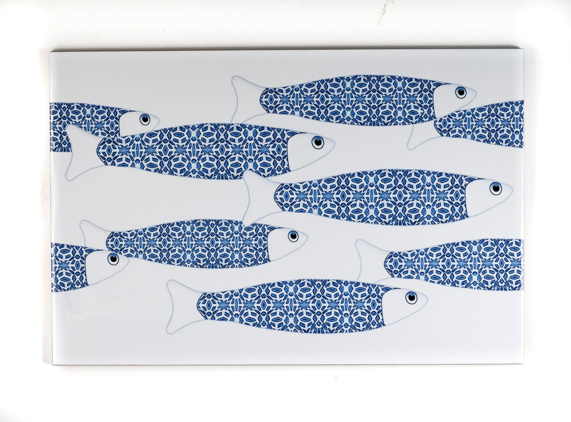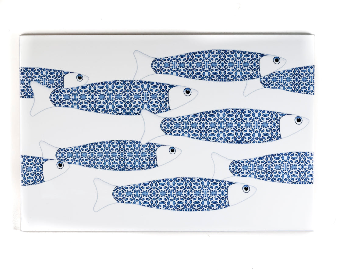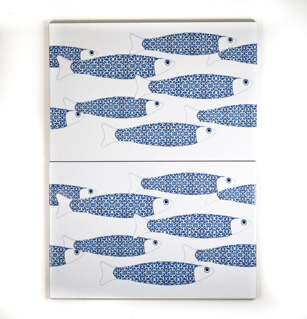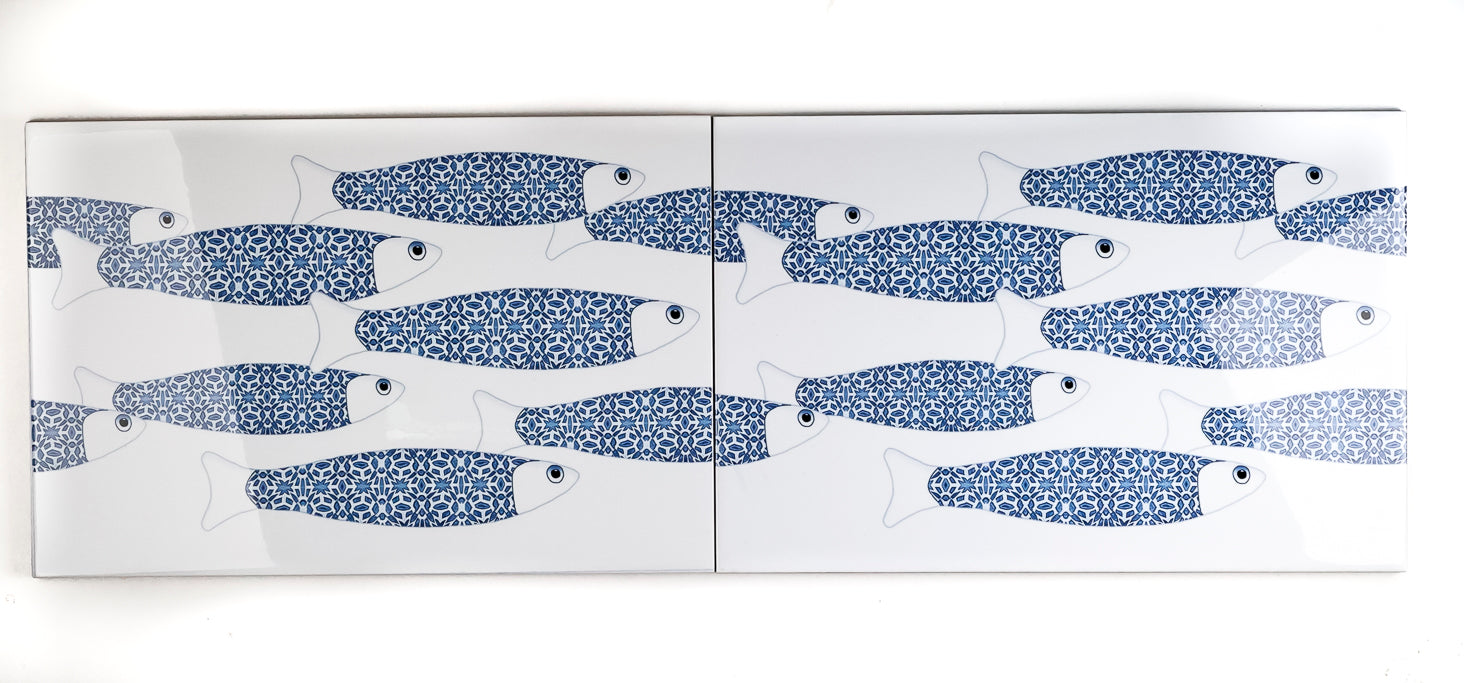 SALE SECONDS - 2x Large Rectangular tiles featuring our popular Blue ocean shoal fish design on a white background, as a border design.