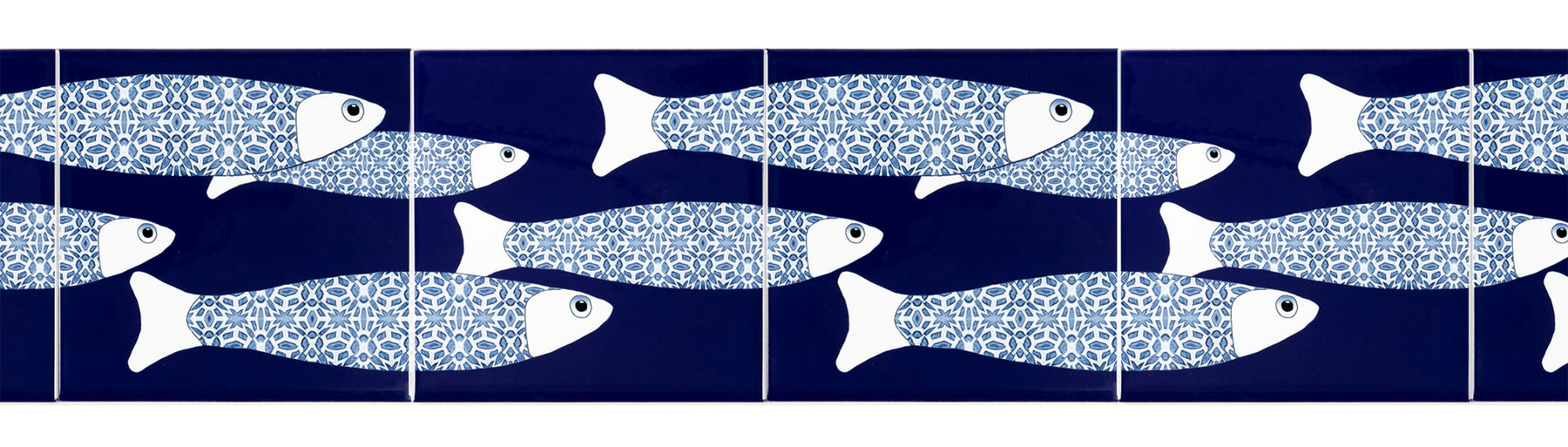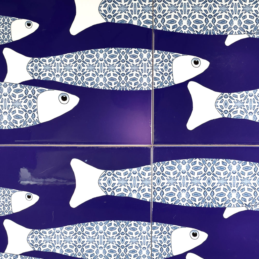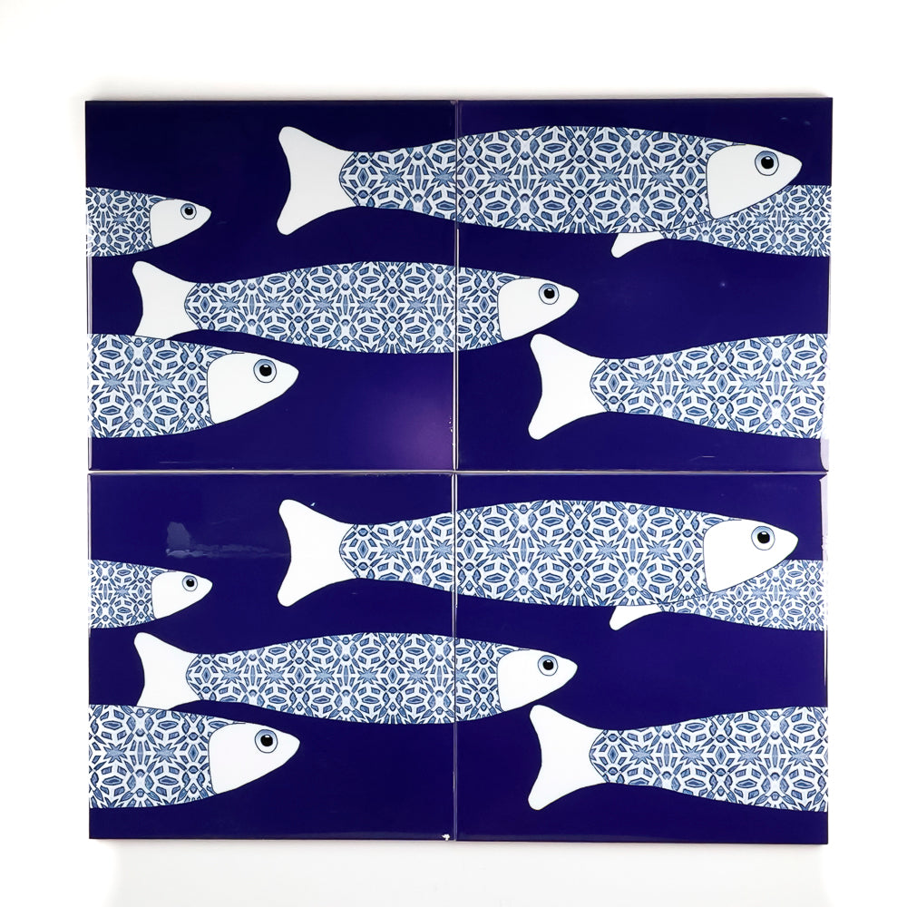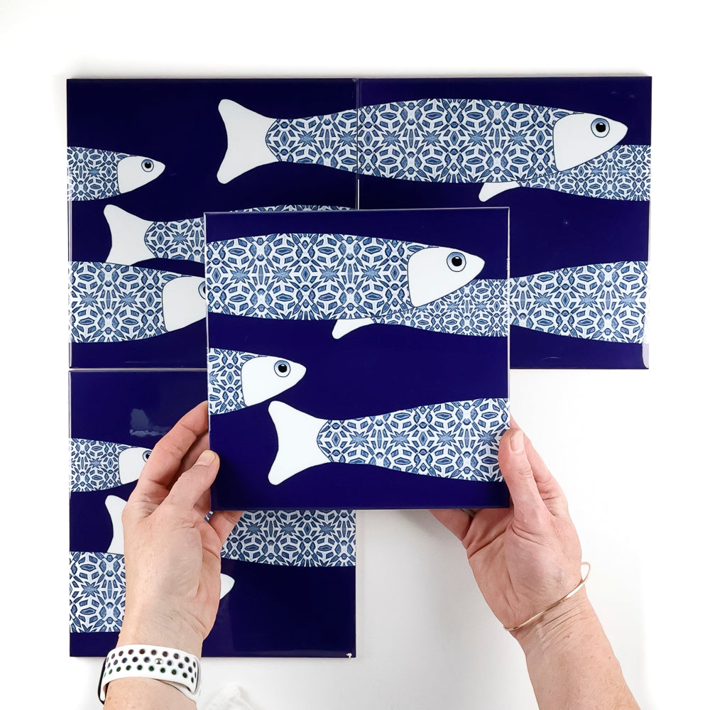 SALE - This is is a set of FOUR 20x20cm tiles featuring our popular Navy Blue Ocean Shoal design. This is the large scale border version (no upper and lower 'half fish') which means they work well as a single row.