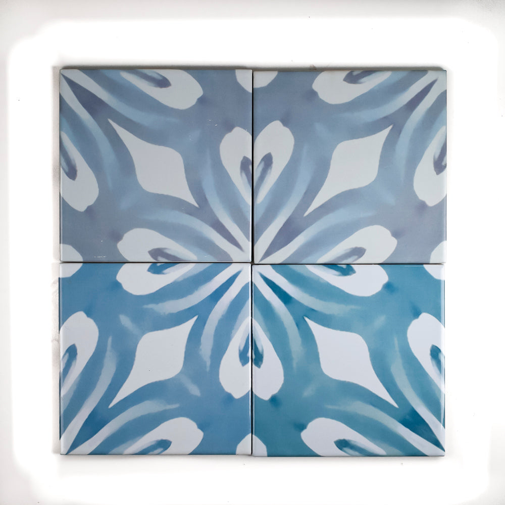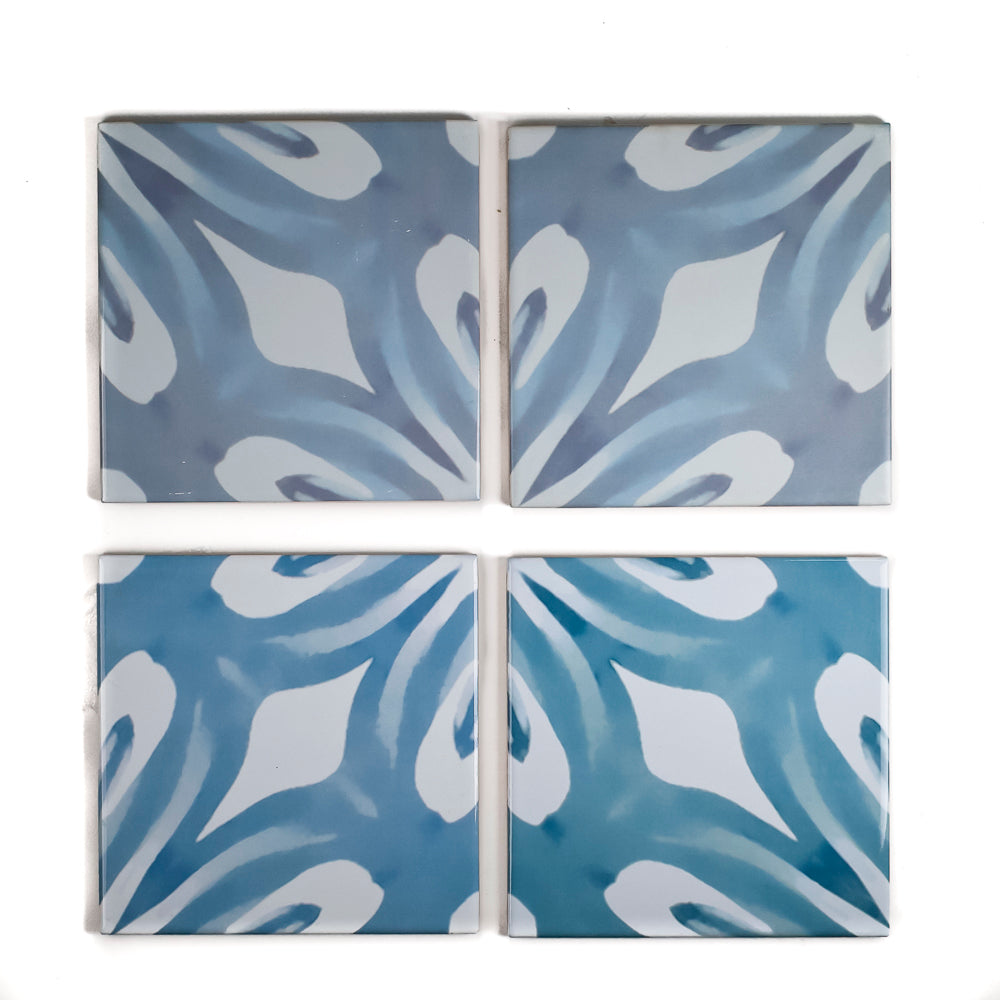 SALE SECONDS - Set of 4x 15cm Fired Ink tiles, each featuring a large scale/section of a mixture of blue millefiori, floral patterns.