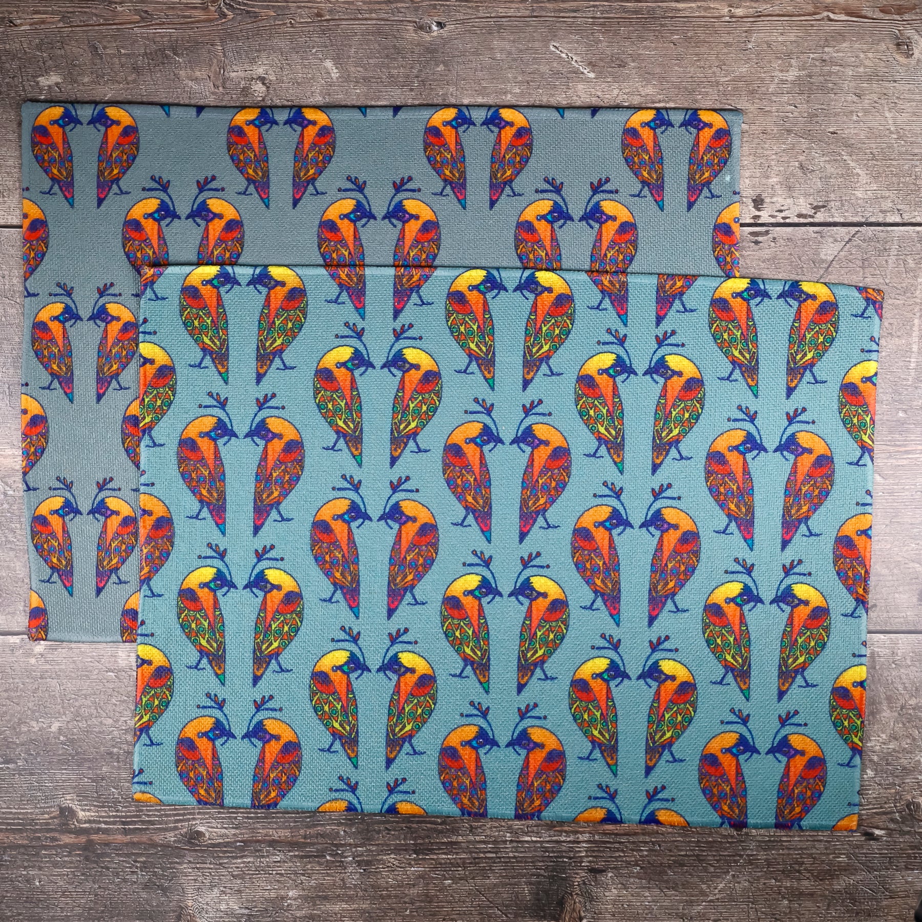 These machine-washable canvas placemats feature a pair of hand-drawn lovebirds in lovely oranges, blues, reds and yellows - all on a charcoal grey background.