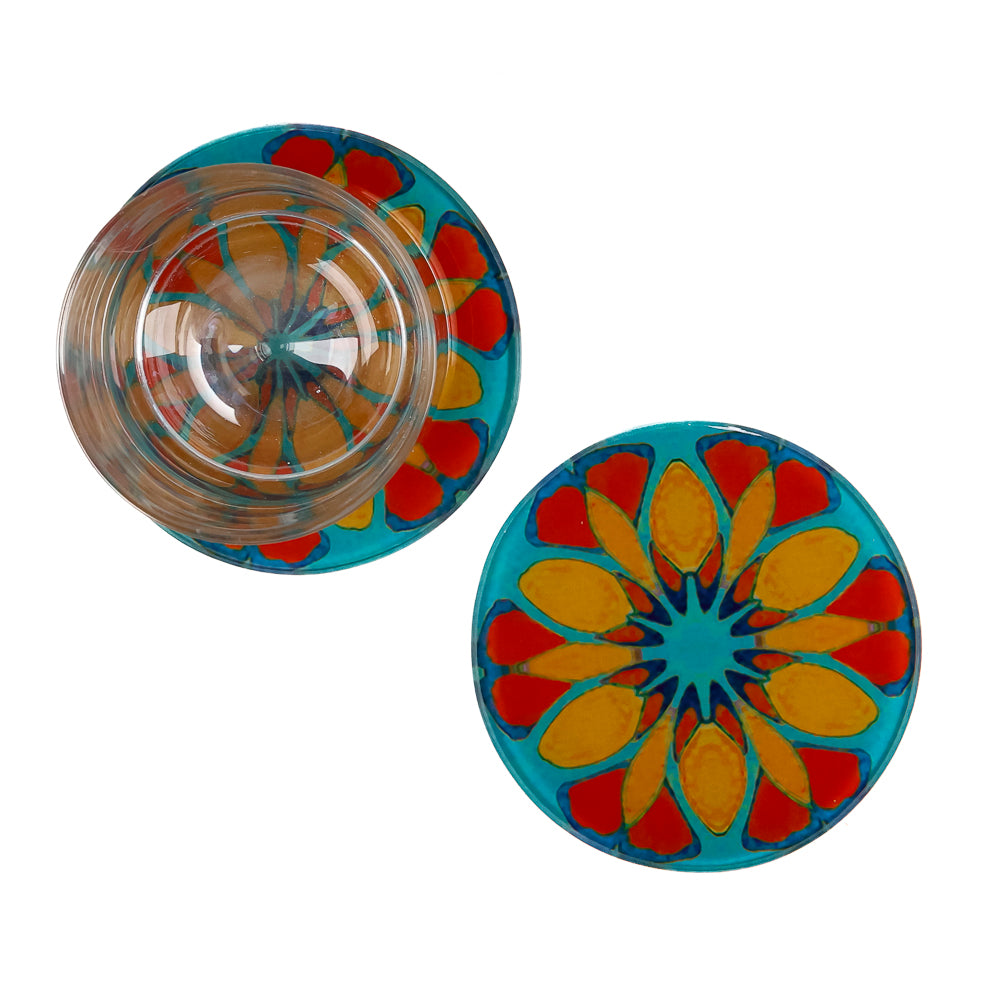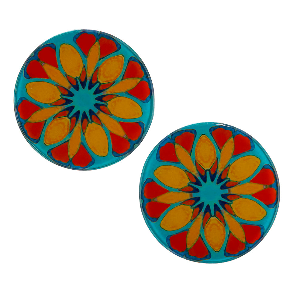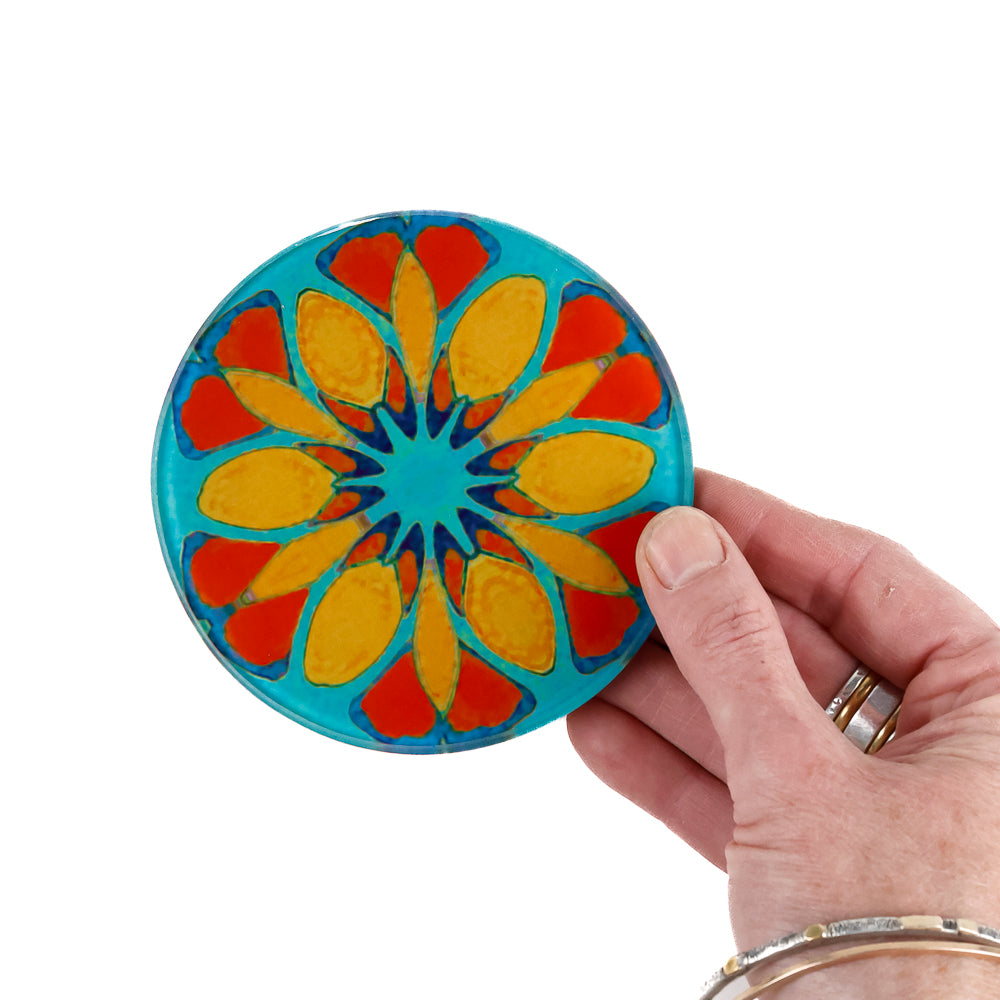 Heavyweight quality glass coaster set with our Moroccan Flower design in bright orange on a bold teal background.