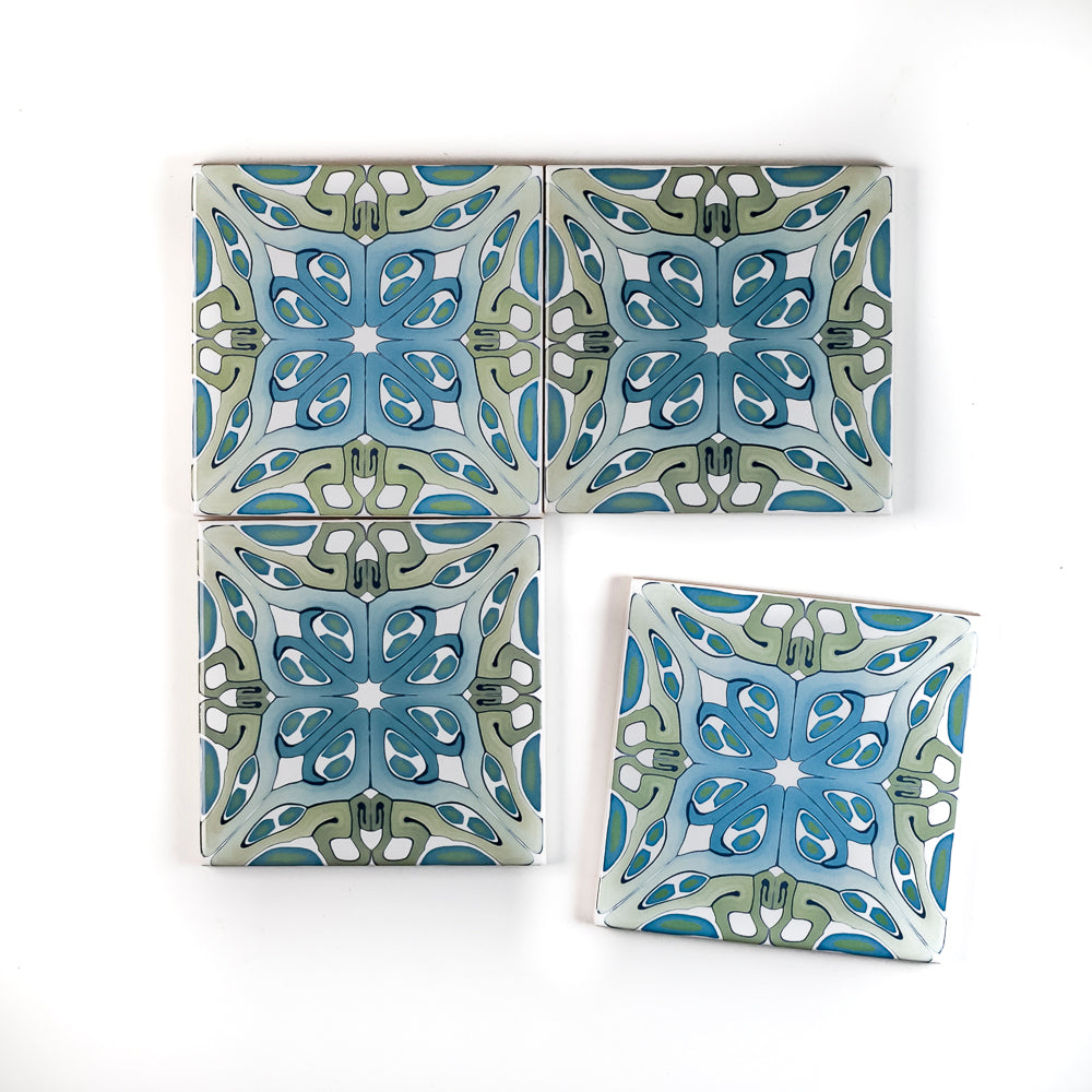 This is a sale set of 4x 10cm fired ink tiles that were previously held as stock samples.