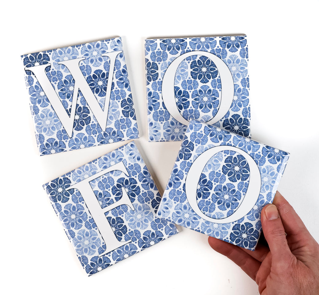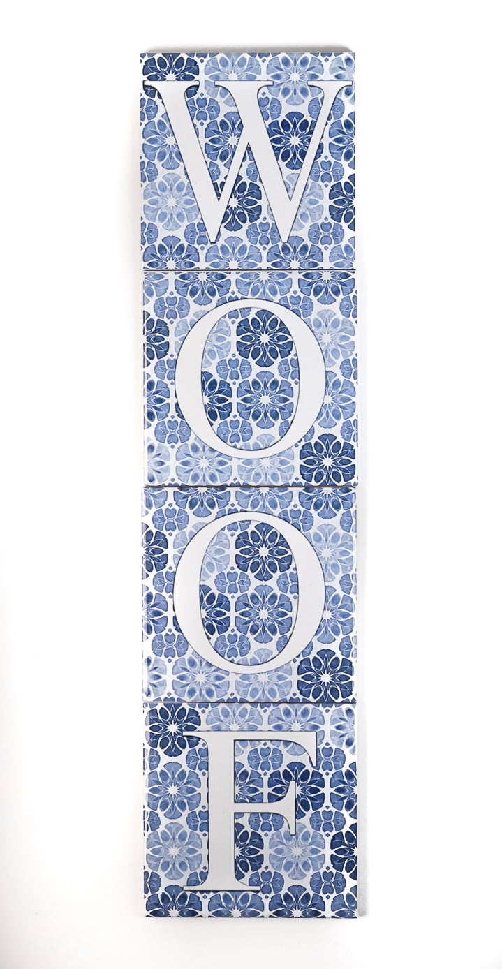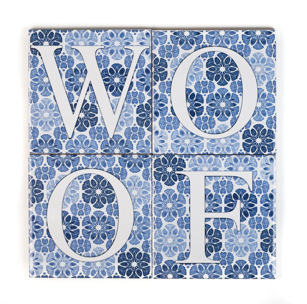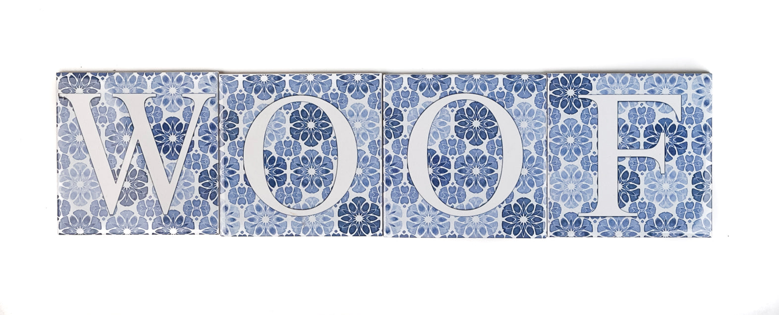 This fun set features the letters "W O O F" in white on a blue and white floral background.