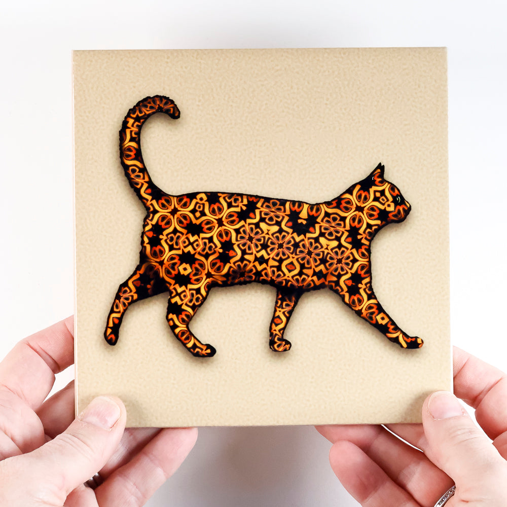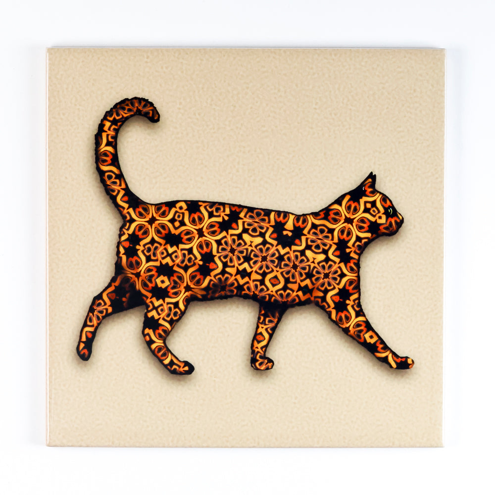 SALE - Single tile created as a prototype of a bright stalking cat on a beige/taupe background.