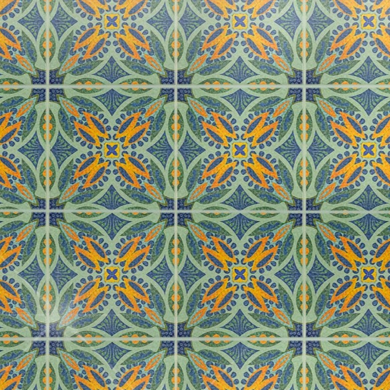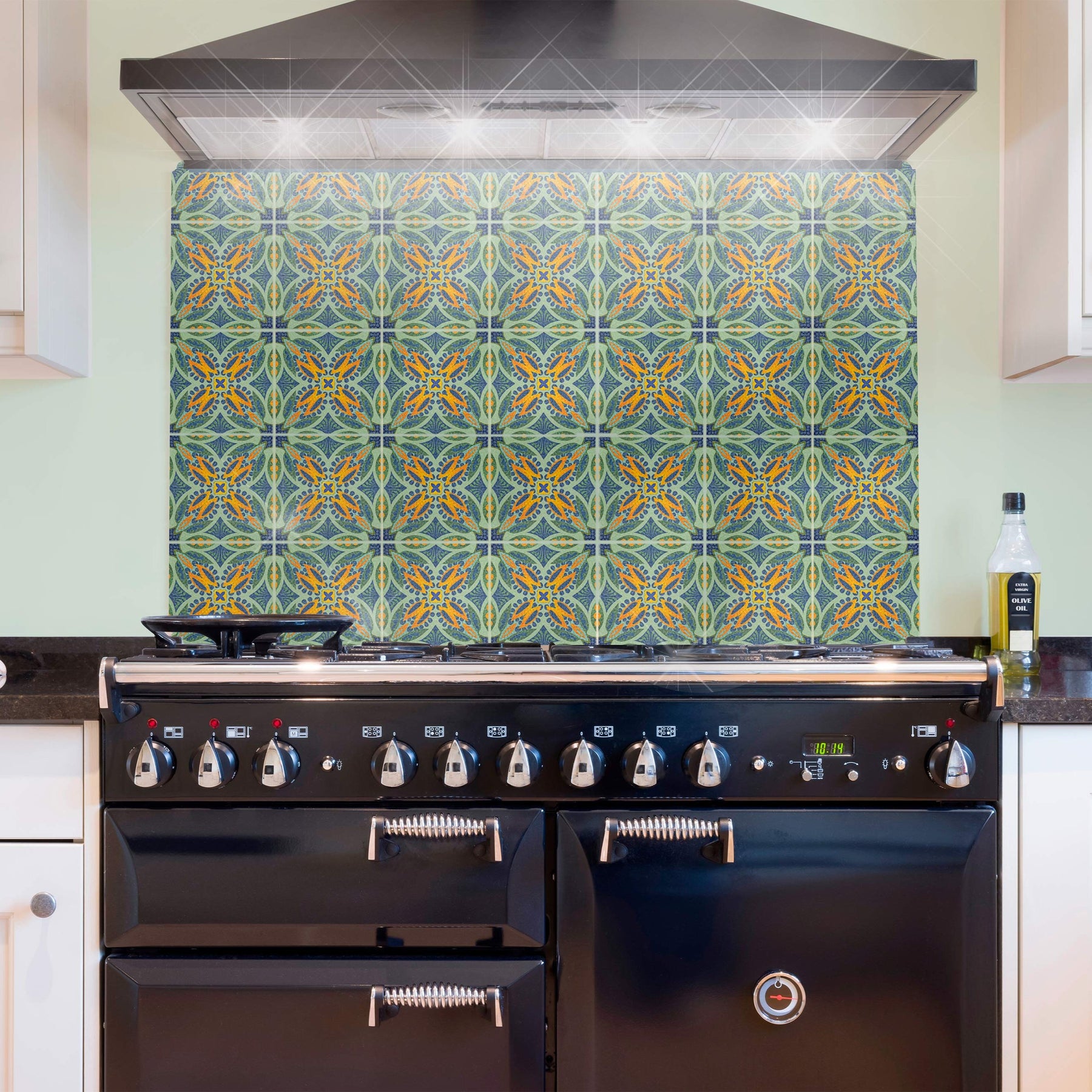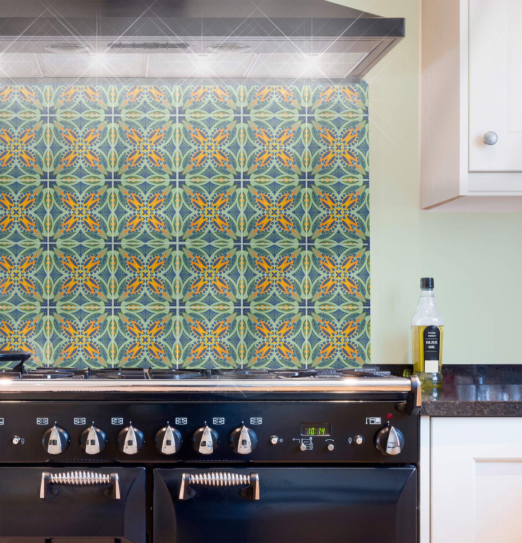 Add some colour and pattern to your kitchen or bathroom with a beautiful bespoke splashback, featuring one of my most popular millefiori designs. 'Thistle' is a lovely pattern in soft greens, blues and oranges, with a very Morris & Co / Arts and Crafts feel.